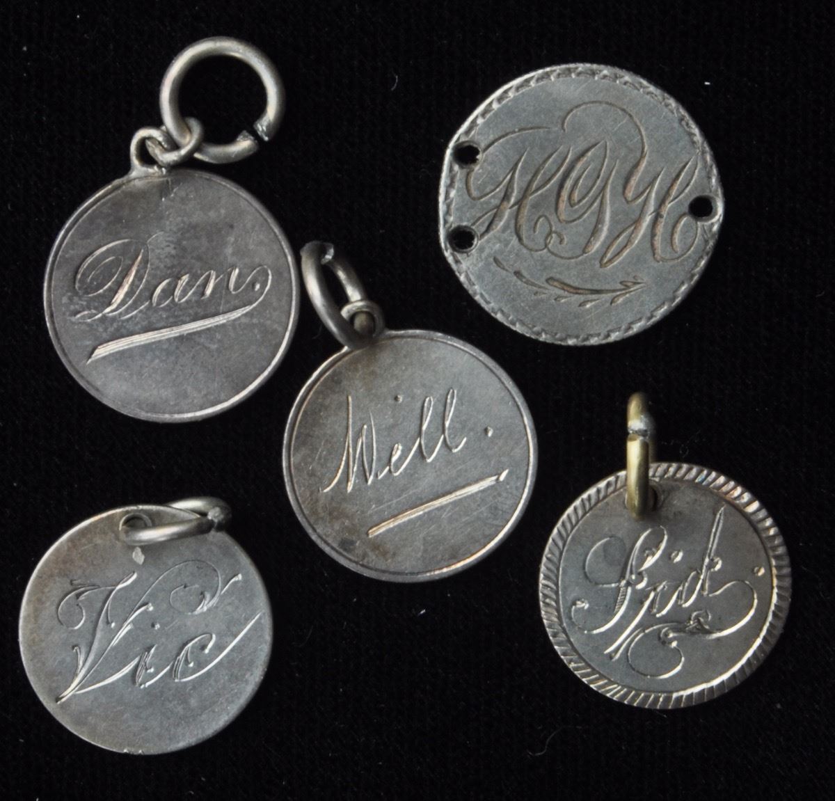 Love Tokens - 5 in total, 4 on British 3 pence pieces and one on a 1977 United States, 3 cent piece.