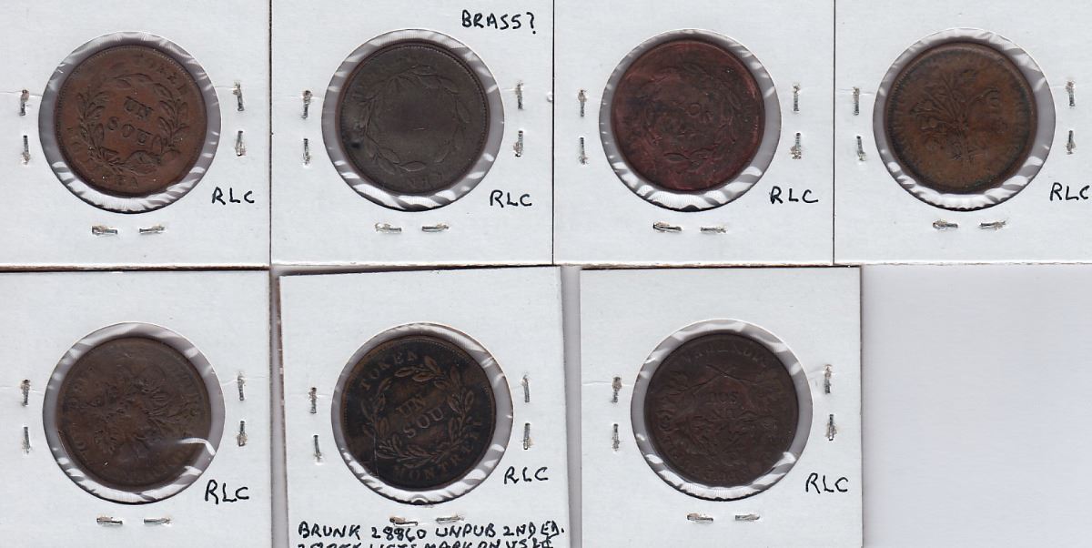 J.W on obv. of Bouquet-Sou, Br 691; J.W.W. on obv. of Bouquet-Sou, Br 686; JOY twice on obv. of Bouquet-Sou, Br 679 (M.I. 552, Brunk J-248); L.A. on rev. of Bouquet-Sou, Br 693 (M.I. 569); (R?).R. LOOMIS. on rev. of Banque du Peuple Bouquet-Sou, Br 715 (M.I. 596, Brunk L-490); N.B. MUNGER on obv. of Bouquet-Sou, Br 694 (M.I. 669, Brunk M-982); N. NASON. on obv. of Banque du Peuple Bouquet-Sou, Br 716 (M.I. 682). 7 Pcs.