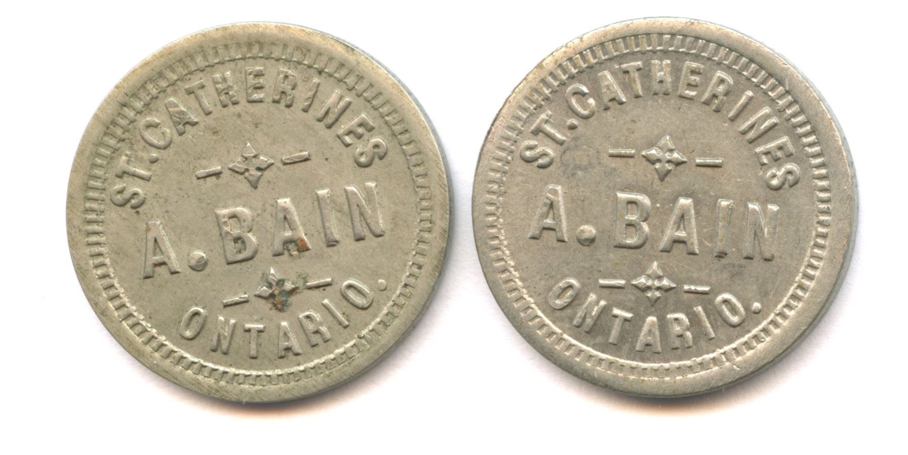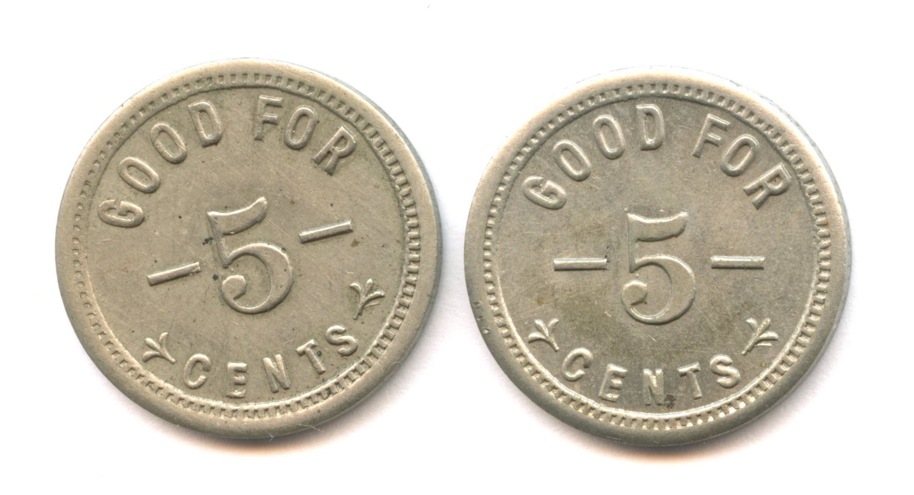 Breton-750. Reportedly issued in 1887. Lot of two (2) tokens. 1.) 19.6mm. 2.77g. Stone-grey with trivial signs of circulation. VF-XF. 2.) 19.6mm. 3.68g. Fully lustrous. Unc. Both examples are struck from rotated dies.