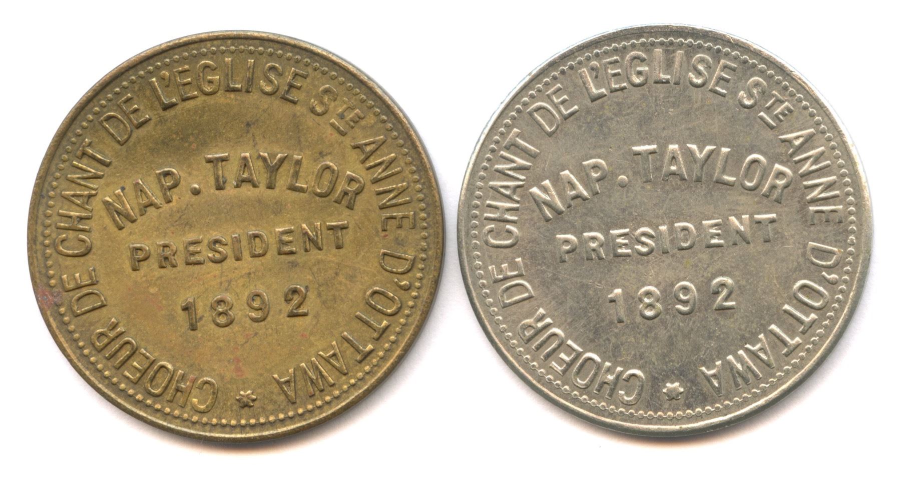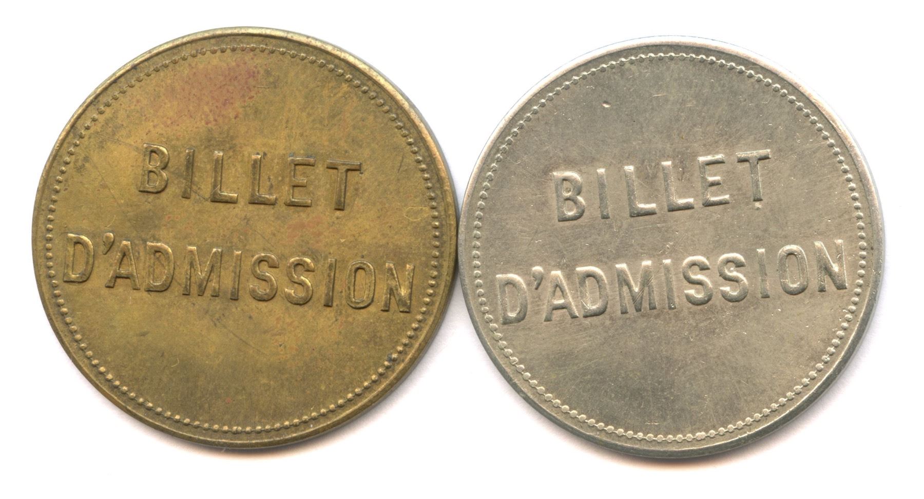 Breton-827. Lot of two (2) pieces, each apparently scarce. Each 29.3mm. 1.) Brass. 6.65g. AU. 2.) White metal. 7.89. Unc.