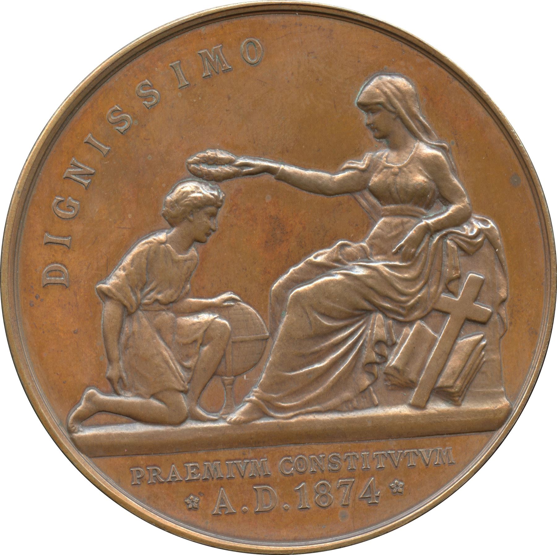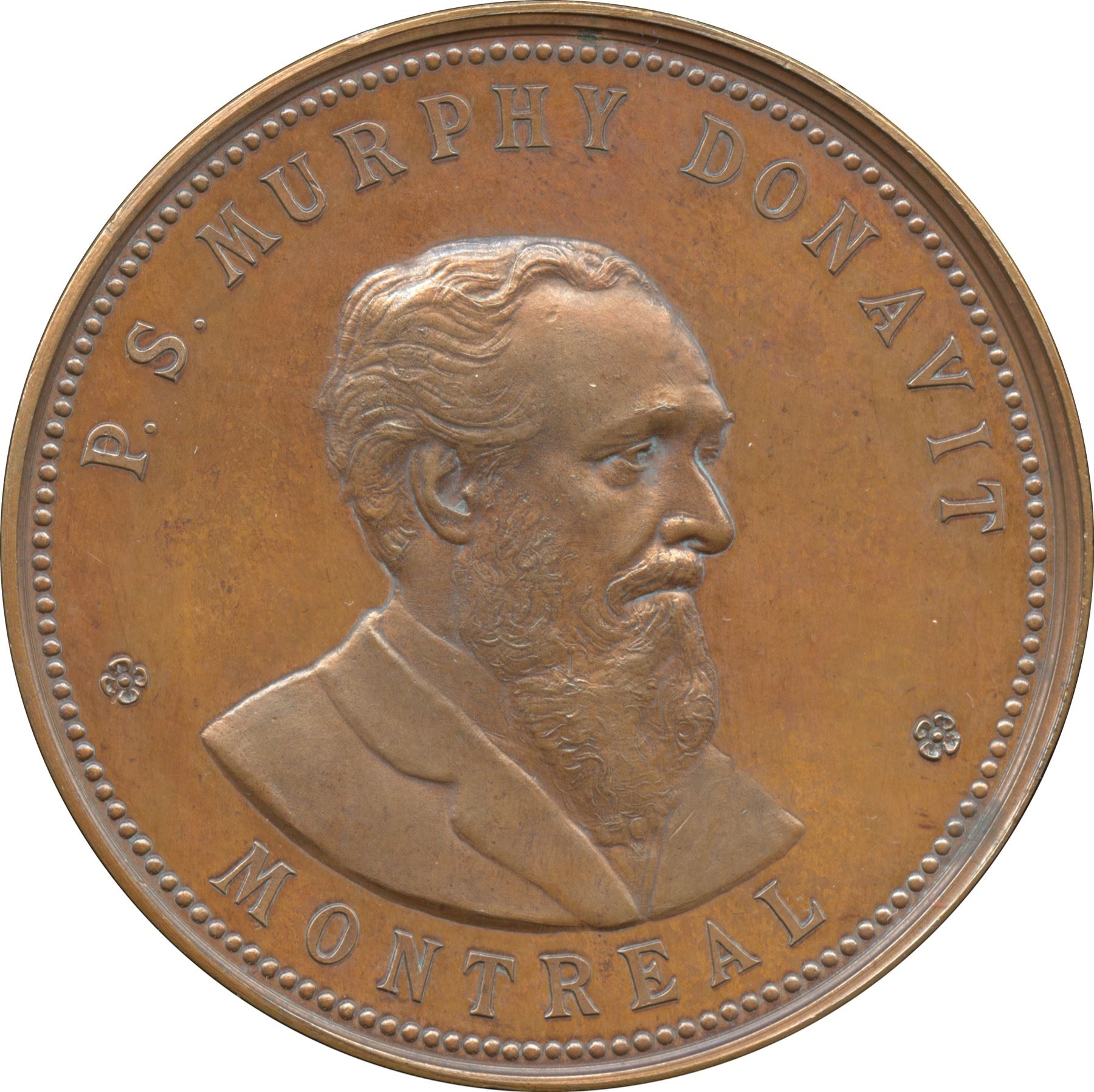 Lr. 1101 — Montreal Catholic Commercial Academy P.S. Murphy Medal. 1874. Copper. 51mm. 64.9g. McLachlan-Unlisted, Breton-124. Cornucopia and CUIVRE on edge. Unsigned. Struck at the Paris Mint after 1879. This is the first of two designs for the P.S. Murphy medal. According to LeRoux, the design “has been refused because the bust does not look like Mr. Murphy.” The fields show minor marks and the still-glossy surfaces are only partially subdued. Free of rim marks. Pleasing eye appeal.