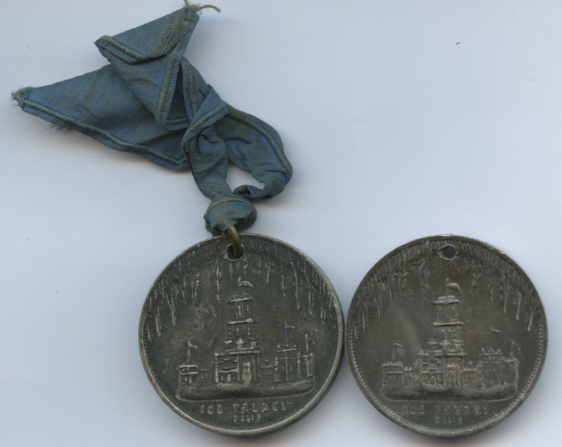 Charlton-EQCC-9. Lot of two medals. Each 30.3mm with plain edges, holed at 12 o’clock, and signed ELLIS. 1.) 15.5 grams. 4 in date scratched out. 2.) 15.9g with faded original blue-green ribbon.