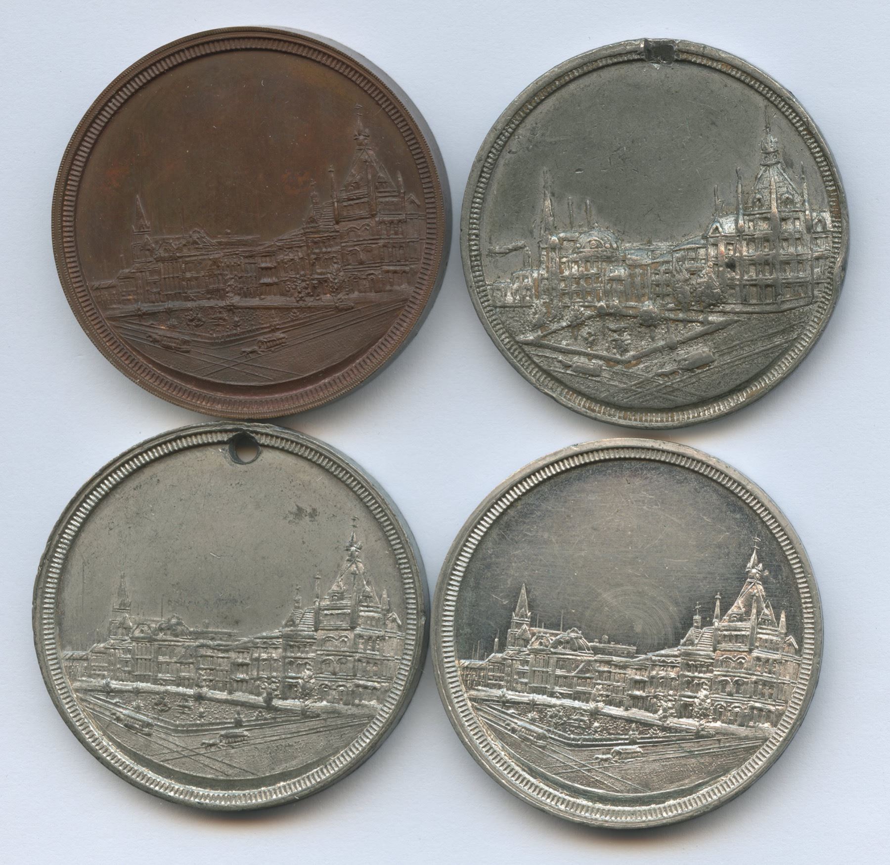 Lot of four pieces. 1.) Lr. 1155. 1887. White metal. Charlton-ENOC-12 (Variety 1). 38.3mm. 22.3g. Plain edge. Signed P.W.E. & CO. 2.) Lr. 1156. 1887. White metal. ENOC-12 (Variety 2). 38.3mm. 22.9g. Plain edge. Signed P.W.E. & CO. 3.) Lr. 1156. 1887. Copper. Charlton-ENOC-12 (Variety 2). 38.3mm. 29.5g. Plain edge. Signed P.W.E. & CO. 4.) Lr. 1160. 1889. White metal. Charlton-ENOC-15. 38.3mm. 17.4g. Plain edge. Holed at 12 o’clock. Unsigned (by Ellis).