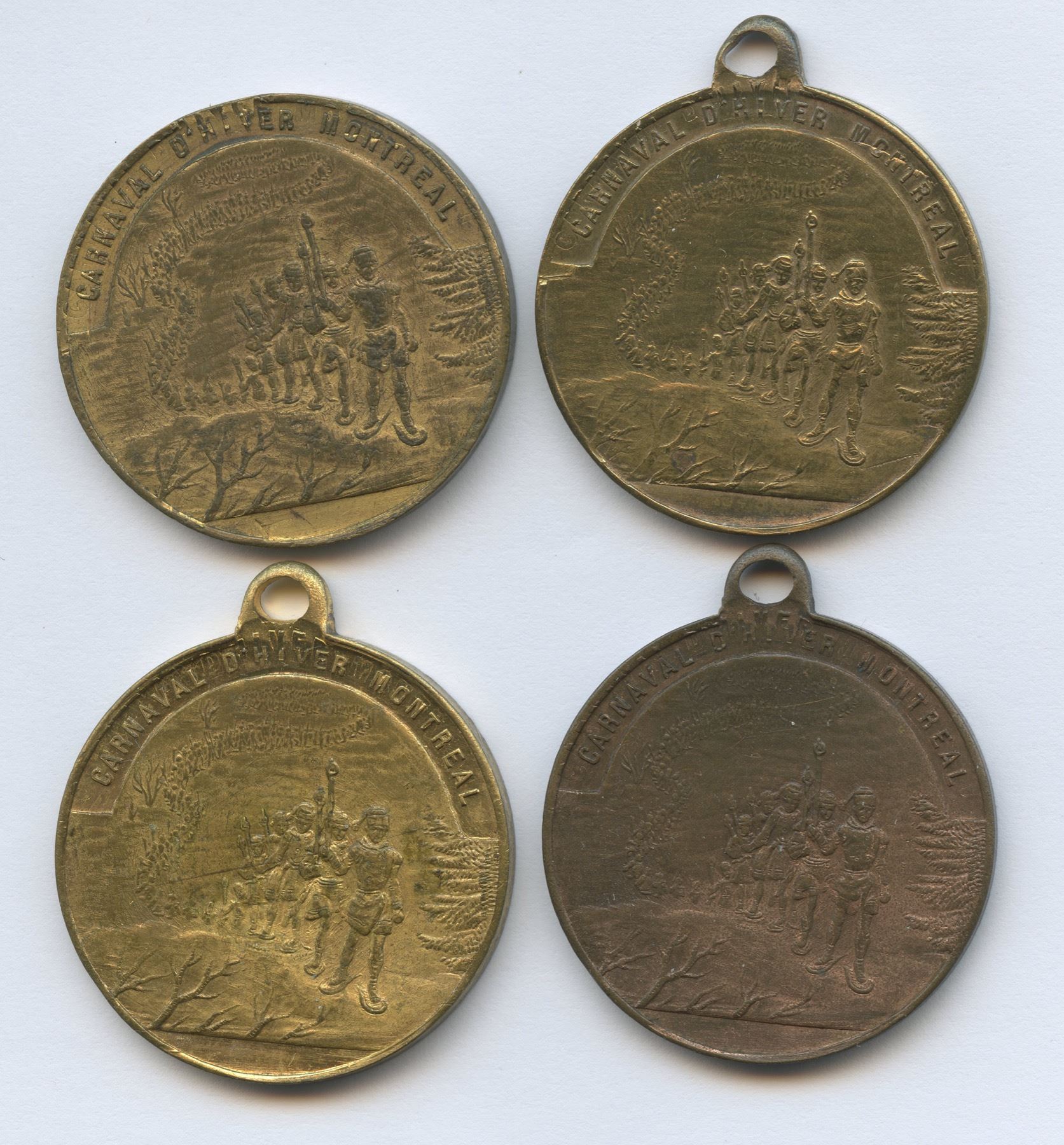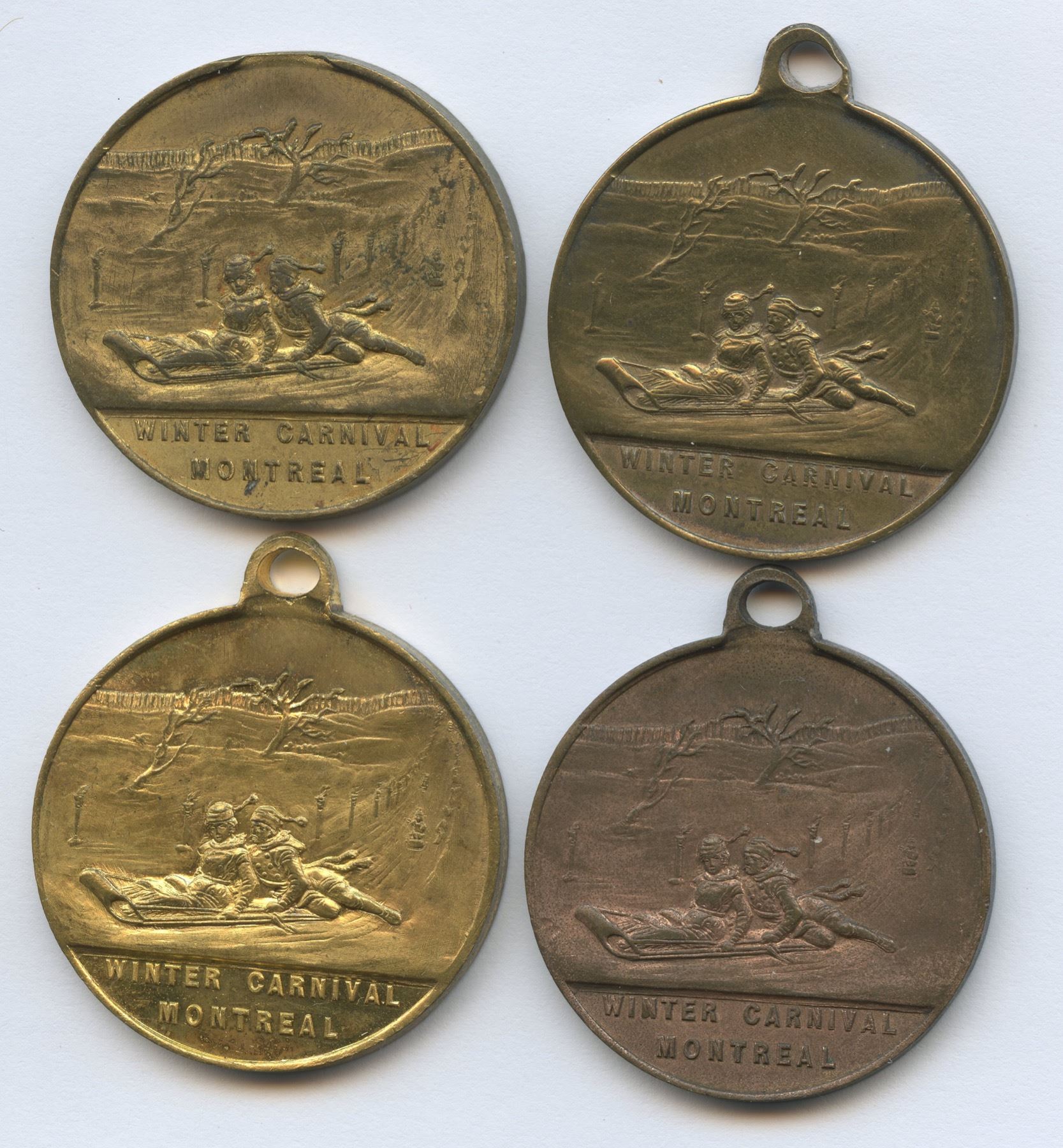 Charlton-EQCC-153. Lot of four. Each 32mm with plain edges and unsigned. 1.) Copper. 13.1g. Integrated loop. 2.). Brass. 12.6g. No loop. 3.) Brass. 12.8g. Integrated loop. 4.) Brass. 12.7g. Integrated loop. Appears to be struck at least twice, possibly three times. Initial impression was widely off-centre. Restruck, and then likely struck again to fully obliterate the off-centre undertype. Design detail is razor-sharp and clearly better than all others seen.