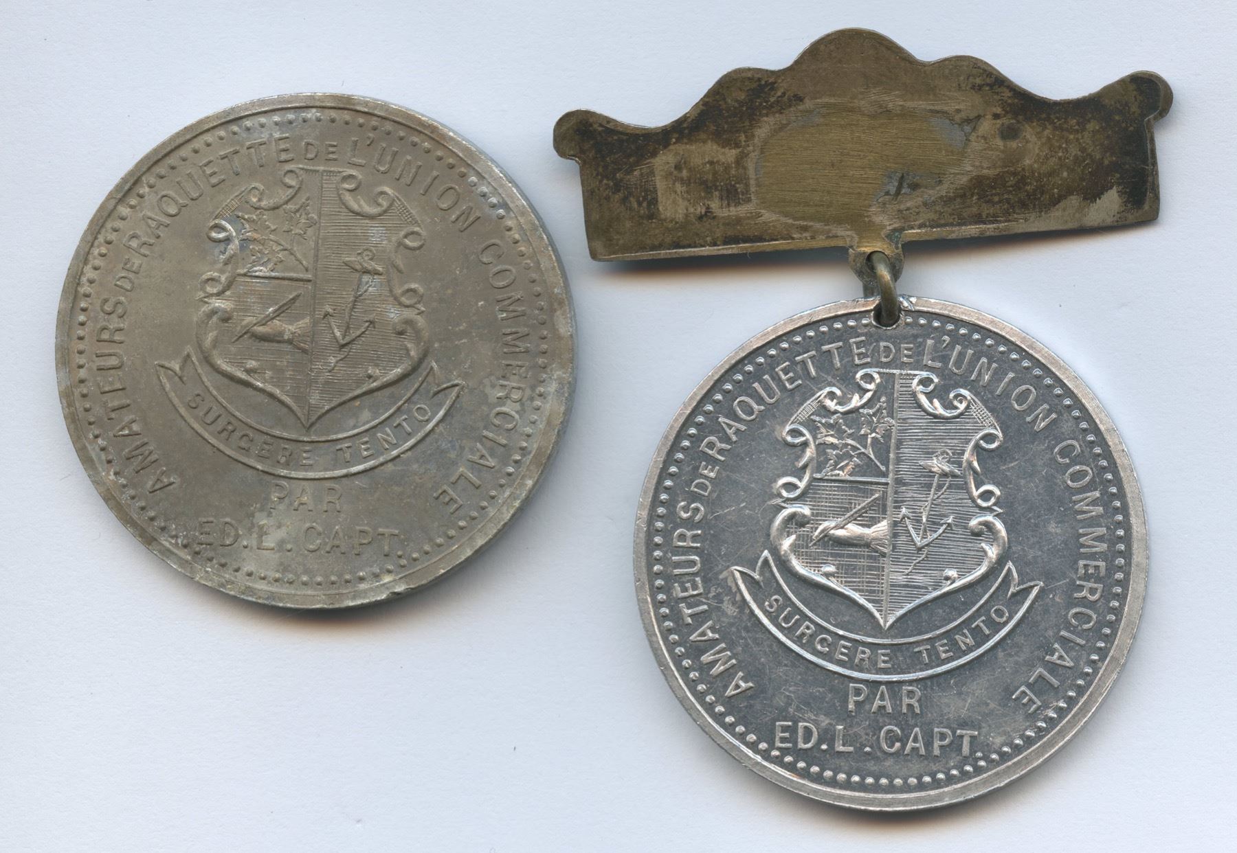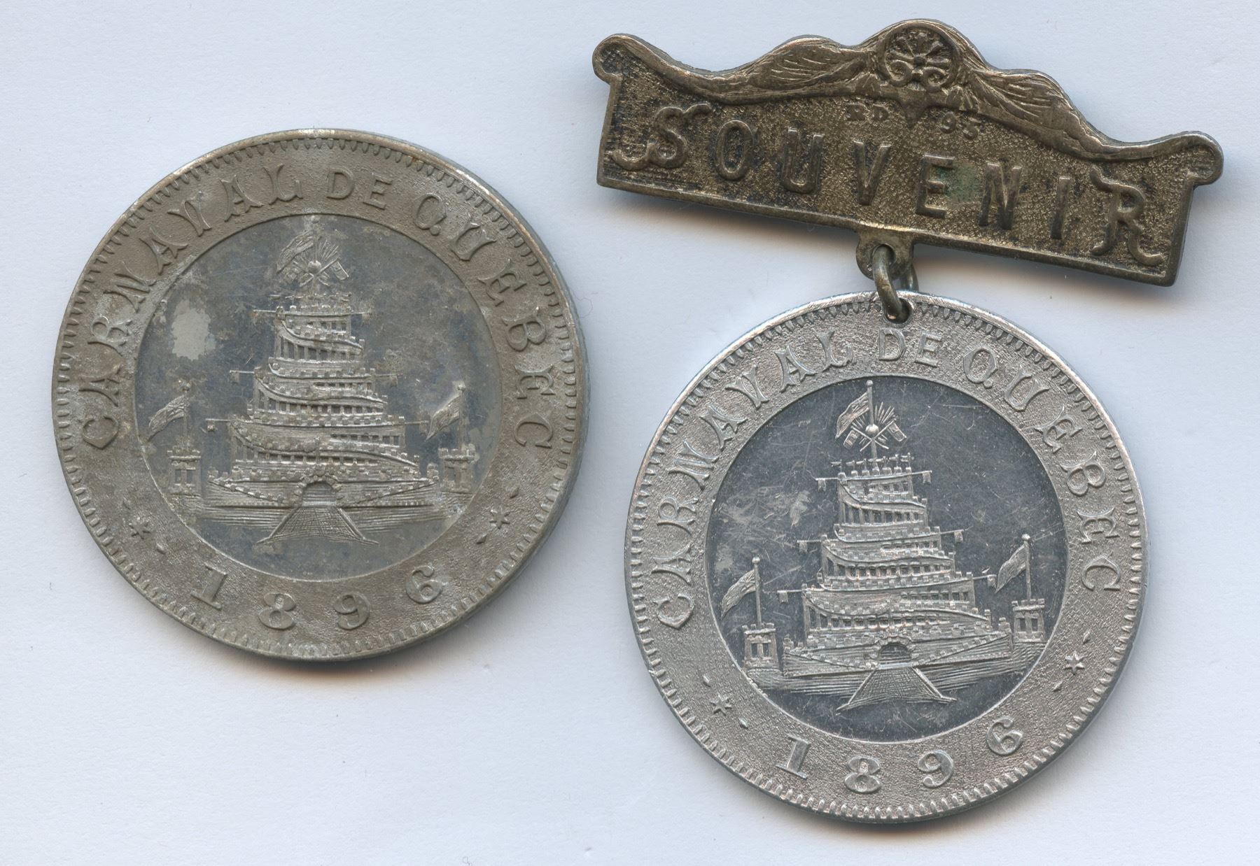 Charlton-EQCC-174. Lot of two. Each 37mm with plain edges and unsigned (by Pritchard & Andrews). 1.) 5.0g. Mottled surfaces, reflective central fields. 2.) 10.3g. Holed at 12 o’clock with ornate bar that reads SOUVENIR and is stamped RD 95. Totally brilliant and beautifully preserved. From the Michael Joffre Collection of Canadian Historical Medals.