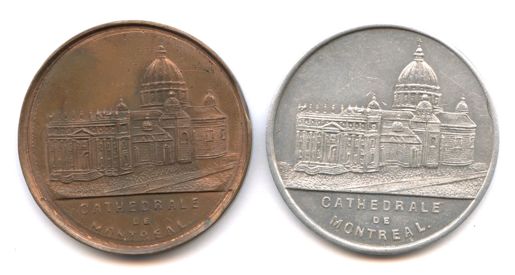 Lot of two (2) medals. 1.) Lr. 1175. 1886. Copper. Signed LYMBURNER. 37.4mm. 20.57g. The 1886 Grand Bazaar was held to raise money for the continued construction of the Cathedral de Montreal. This copper example was probably cleaned at some point, but it has an interesting clip at 2:30. Evidence of what may be a possible undertype appears around the inside of the rims on each side. 2.) Lr. 1175a. 1897. Aluminum. Cathedrale de Montreal / Archbishop Paul Bruchesi. 37.3mm. 4.54g. Well-preserved.
