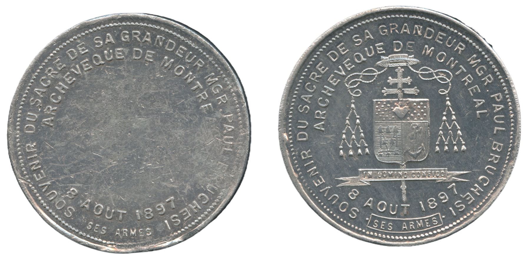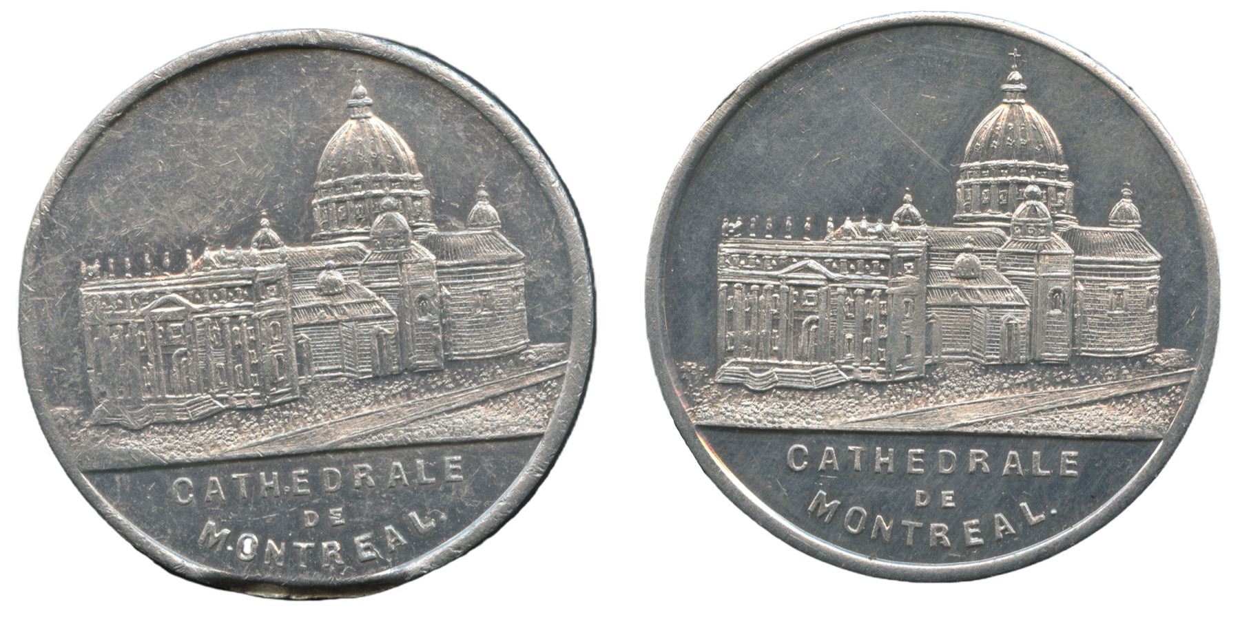 Lot of two, both in aluminum and measuring 37mm with plain edges. Obverse dies are the same — that of Lr. 1175. However, the reverse differs and one lacks the arms of the archbishop entirely, with other small difference. 1.) 4.6g. With arms. Completely brilliant and unworn. 2.) 4.5g. Without arms. Slightly less flashy and lacking a portion of the rim below MONTREAL. An interesting pair. From the Michael Joffre Collection of Canadian Historical Medals.