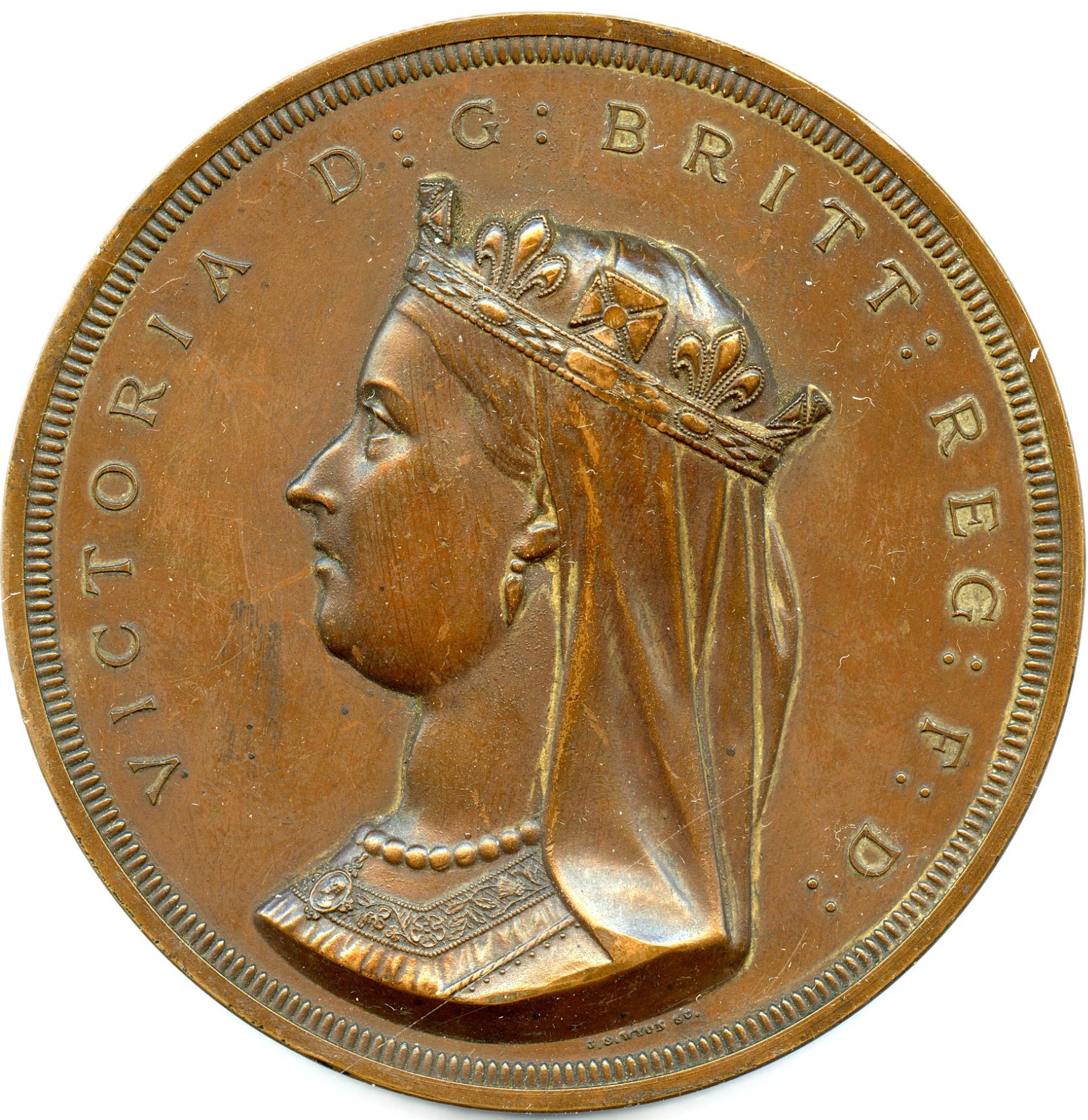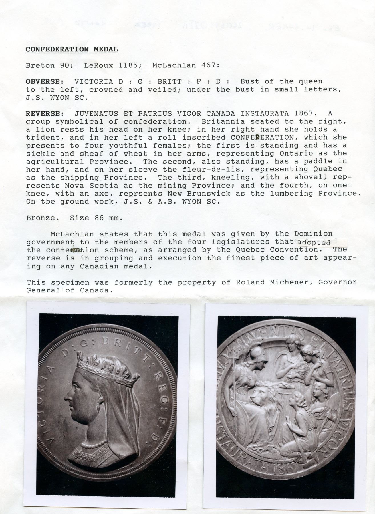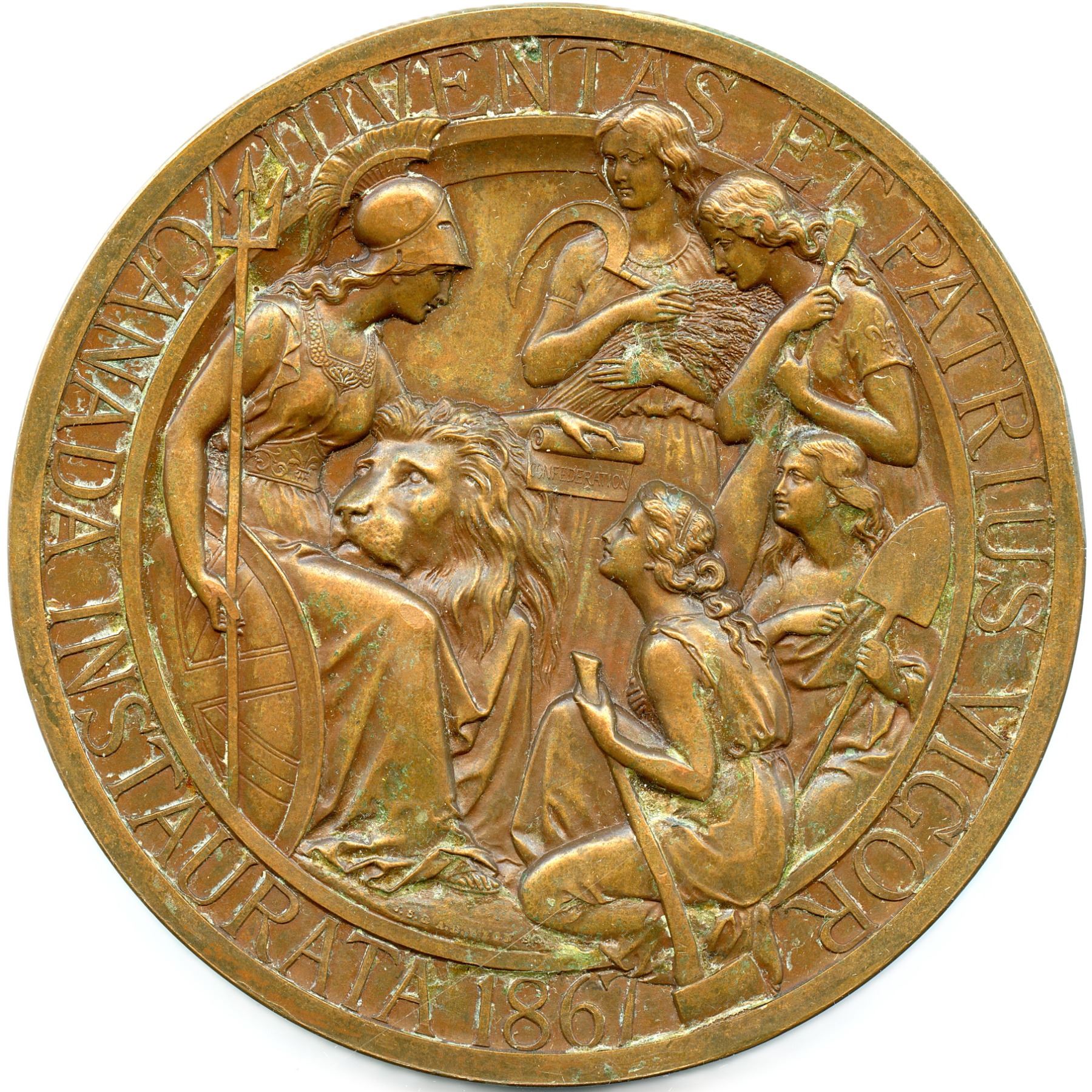 McLachlan 476, Br. 90, 264.2g, 76.3mm, Plain edge, Signed J.S. and A.B. WYON, The Wyons struck one example in gold for Queen Victoria, fifty in silver, and 500 pieces in bronze, This medal is the most sought-after in Canadian numismatics, Chocolate-brown surfaces, There are a few contact marks, dig at the N in Juventas, Specks of verdigris on reverse, Ex. Roland Michener; Warren Baker. EF. Note: this lot is part of The Harry N. James Collection.