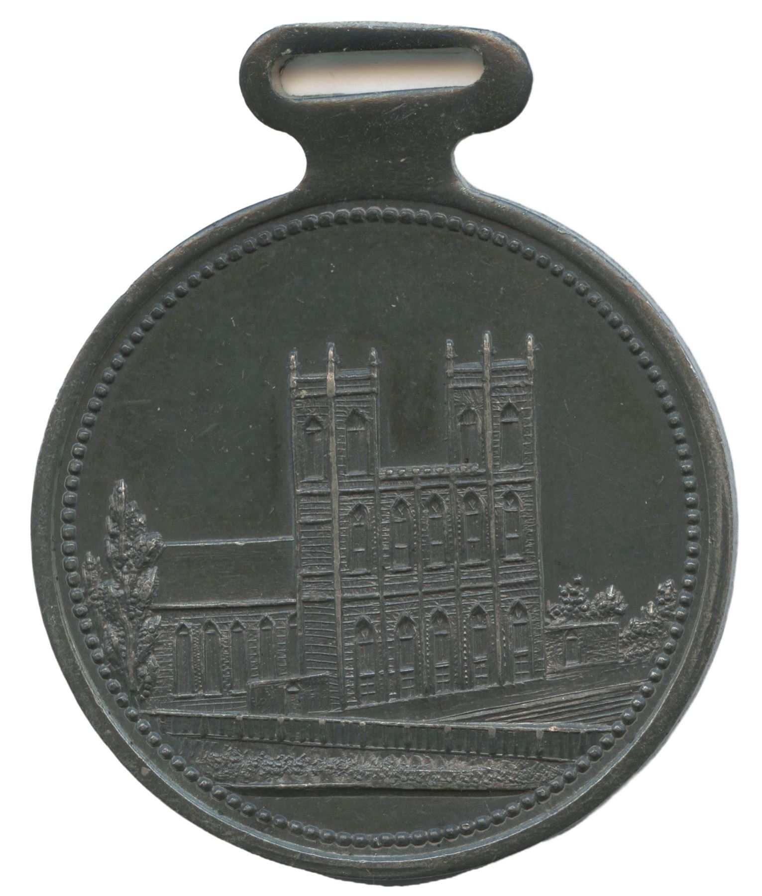 23.8mm. 38.5g. Plain edge. Unsigned. Integrated rectangular hanger. A centennial commemorative with deep, even toning.
