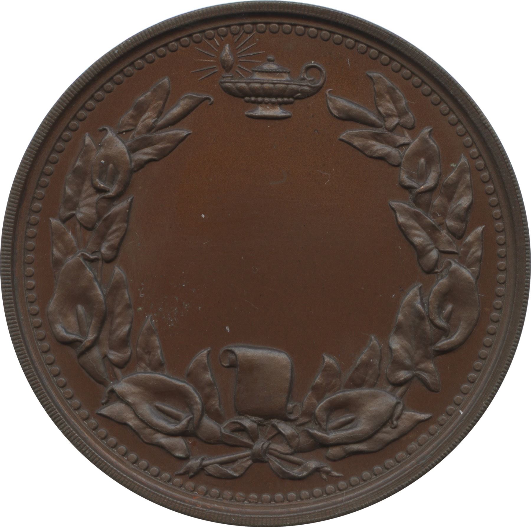 34.2mm. 16.9g. Plain edge. Signed P.W. ELLIS & CO TORONTO. The obverse features an attractive view of the Whitby, Ontario college, while the reverse shows a wreath of arum lilies and a Lamp of Knowledge above. A perfect, glossy example. Unnamed. From the Michael Joffre Collection of Canadian Historical Medals.