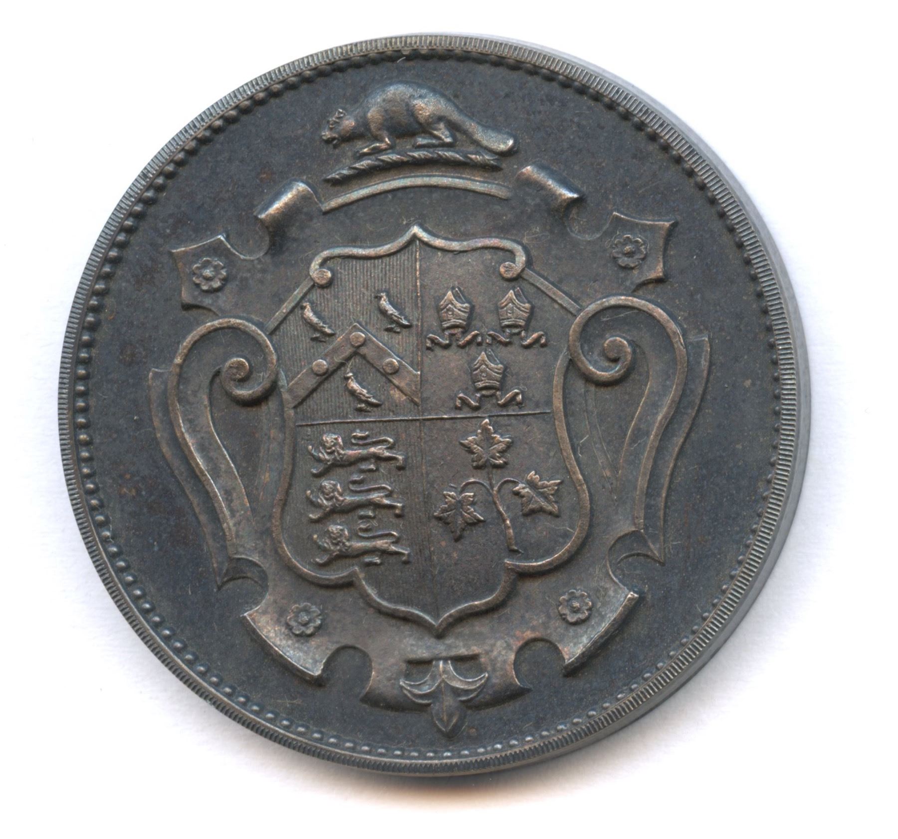 38.5mm. 24.60g. Plain edge. Unsigned. LeRoux lists this reverse as having a wreath, but the present example and others seen instead show the coat of arms of Ridley College in St. Catherines, Ontario. The reverse field is inscribed 1ST / 220 YDS JR. / 1896. No name is present. Deeply toned in gunmetal-blue patina.