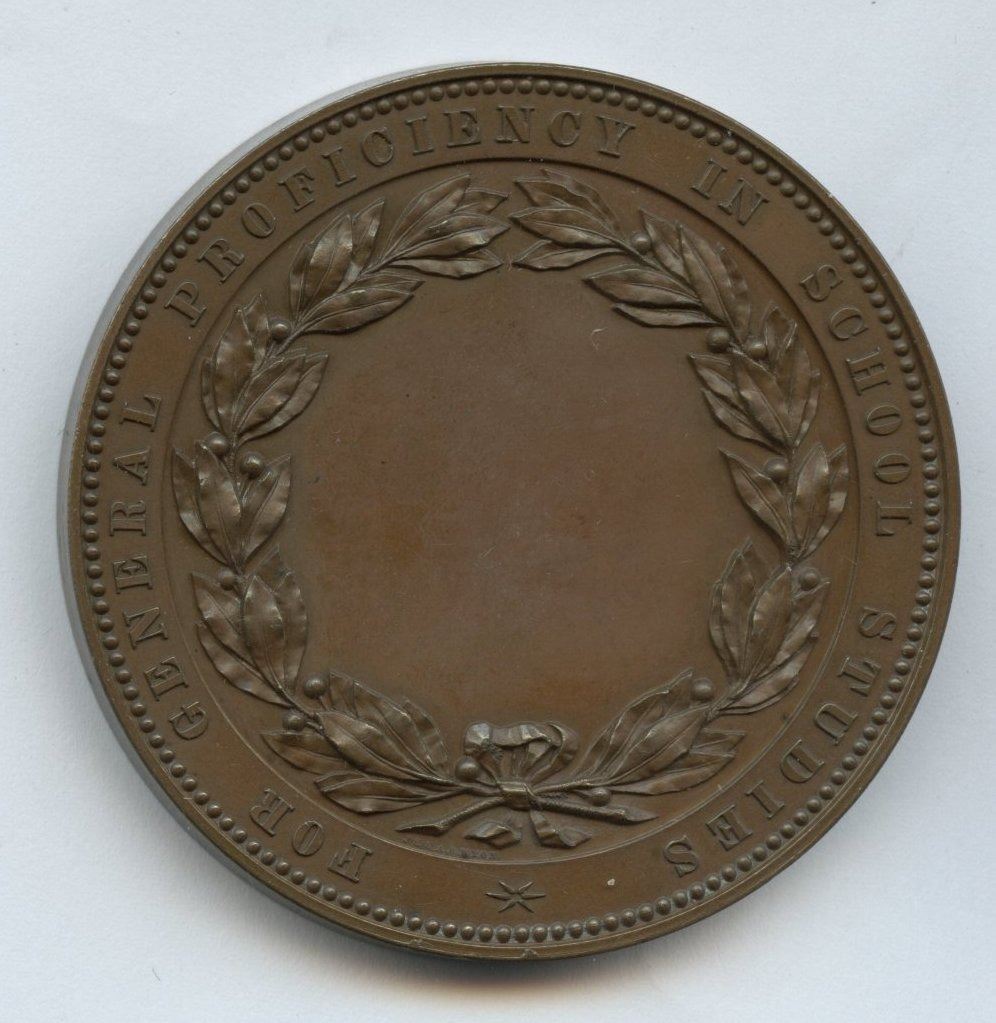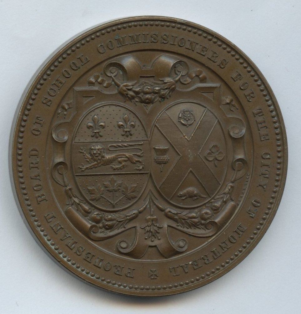 McLachlan-171, Breton-135. 57.5mm. 89.67g. Plain edge. Signed J.S. & A.B. WYON. These medals were designed to be used by all schools under the Montreal Protestant School Board.