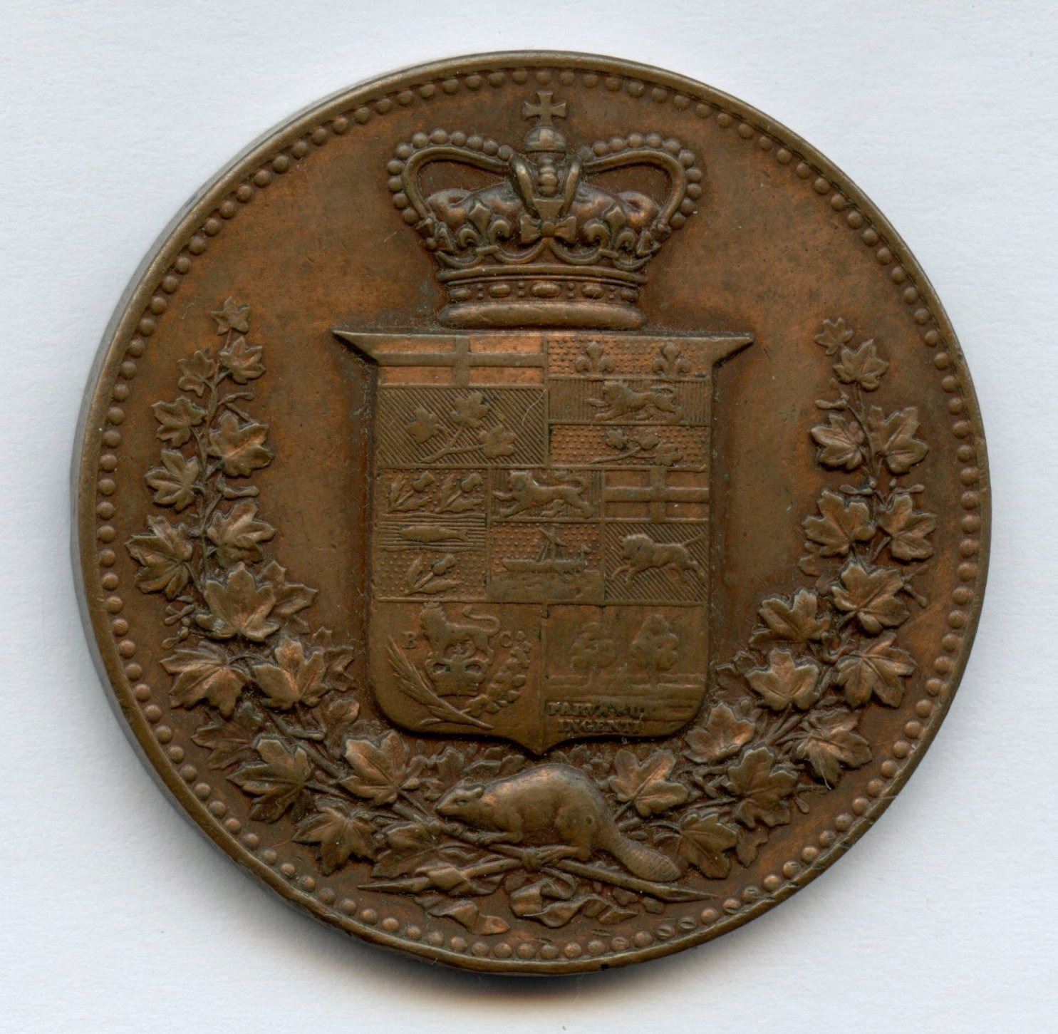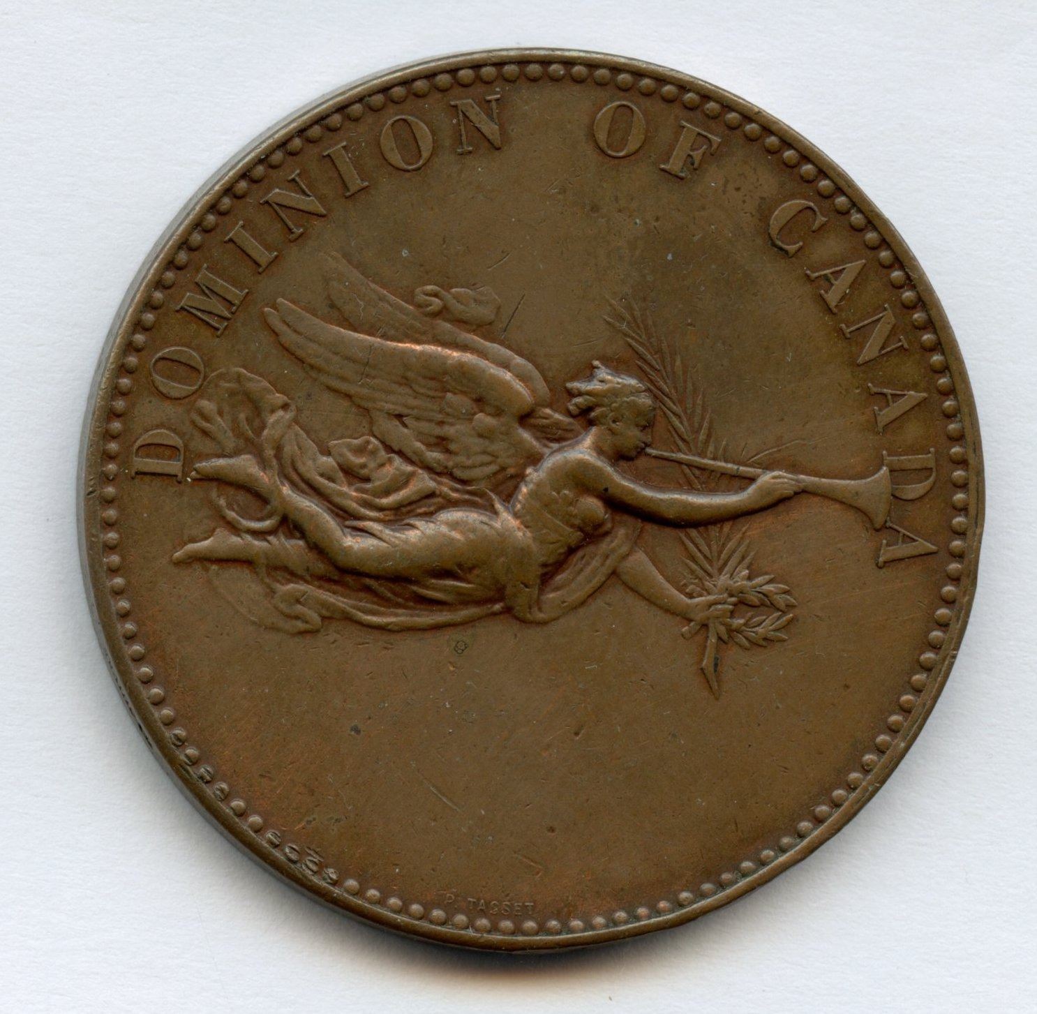 McLachlan-484, Charlton-EDOA-3. 41.4mm. 32.9g. Cornucopia and CUIVRE on edge. Signed P. TASSET. Struck at the Paris Mint after 1879. McLachlan writes in Canadian Numismatics: “This medal was first given in gold, silver and bronze to the Canadian exhibitors at the Centennial Exhibition in 1876 [in Philadelphia]. It has been given at one or two Dominion Exhibitions since then. The dies were executed in Paris on the order of Mr. Perault, who was one of the Canadian Commissioners at the Exhibition. The relief is low, and the angel on the obverse a stock design.” This is an unnamed example with golden-brown surfaces and red-violet colour around the devices.