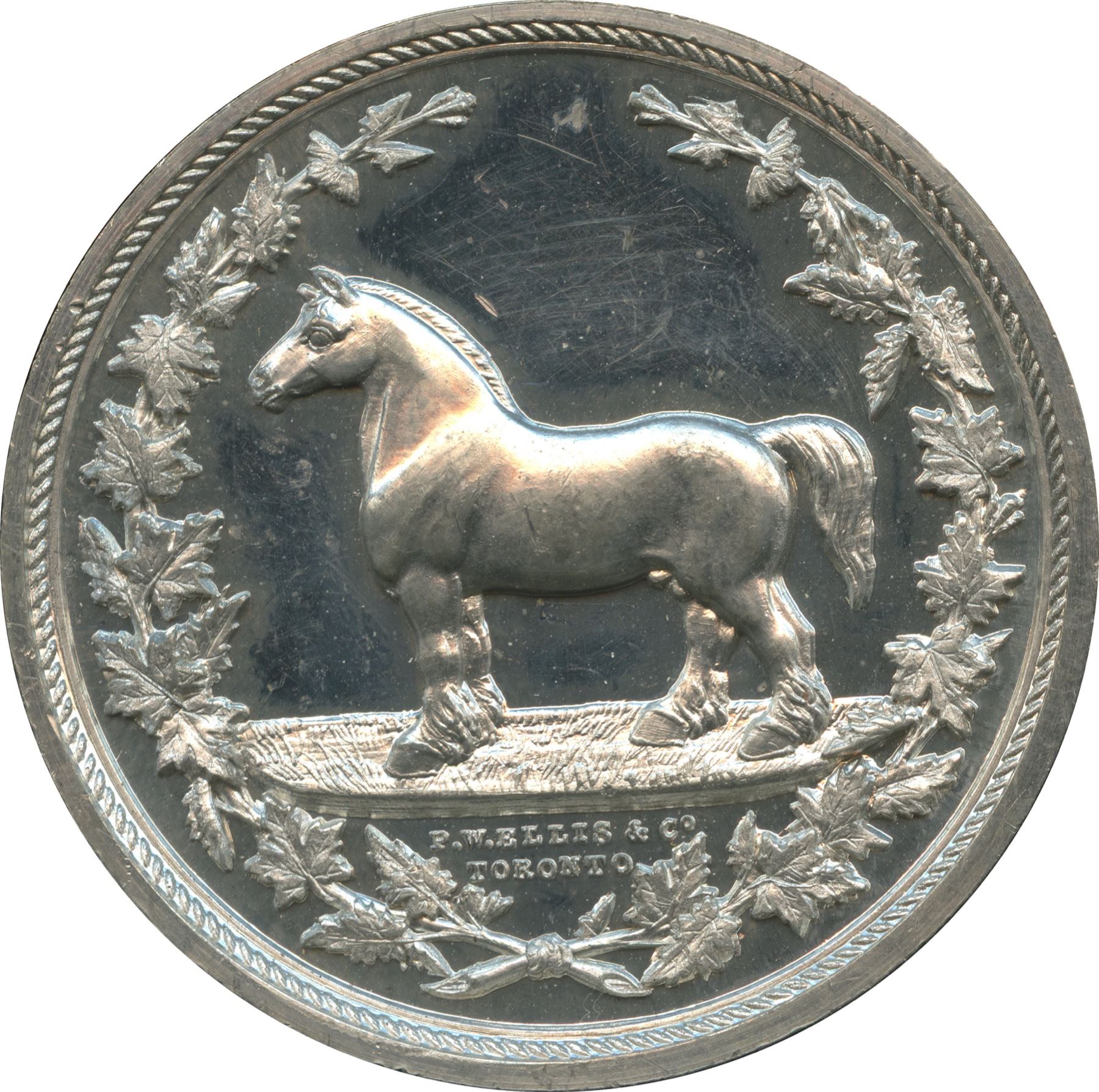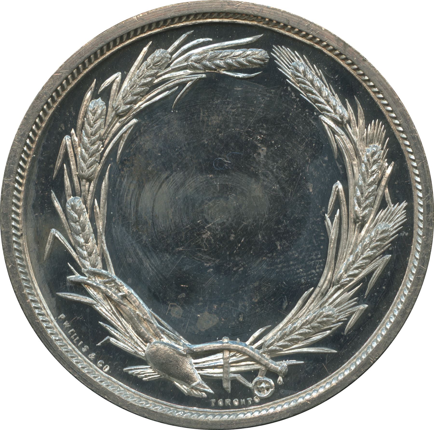 38.8mm 26.6g. Plain edge. Signed P.W. ELLIS TORONTO. Obverse is identical to that of the reverse of the previous lot (Lr. 1471). The reverse features a wreath of wheat with a plow in the place a bow. Like the preceding lot, both sides are utterly brilliant and deeply contrasted. No significant hairlines.