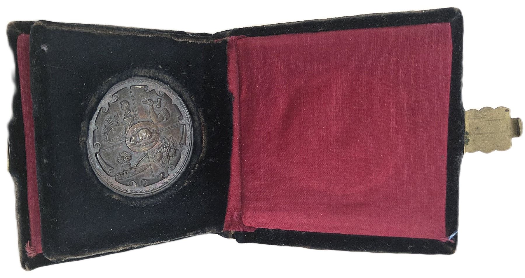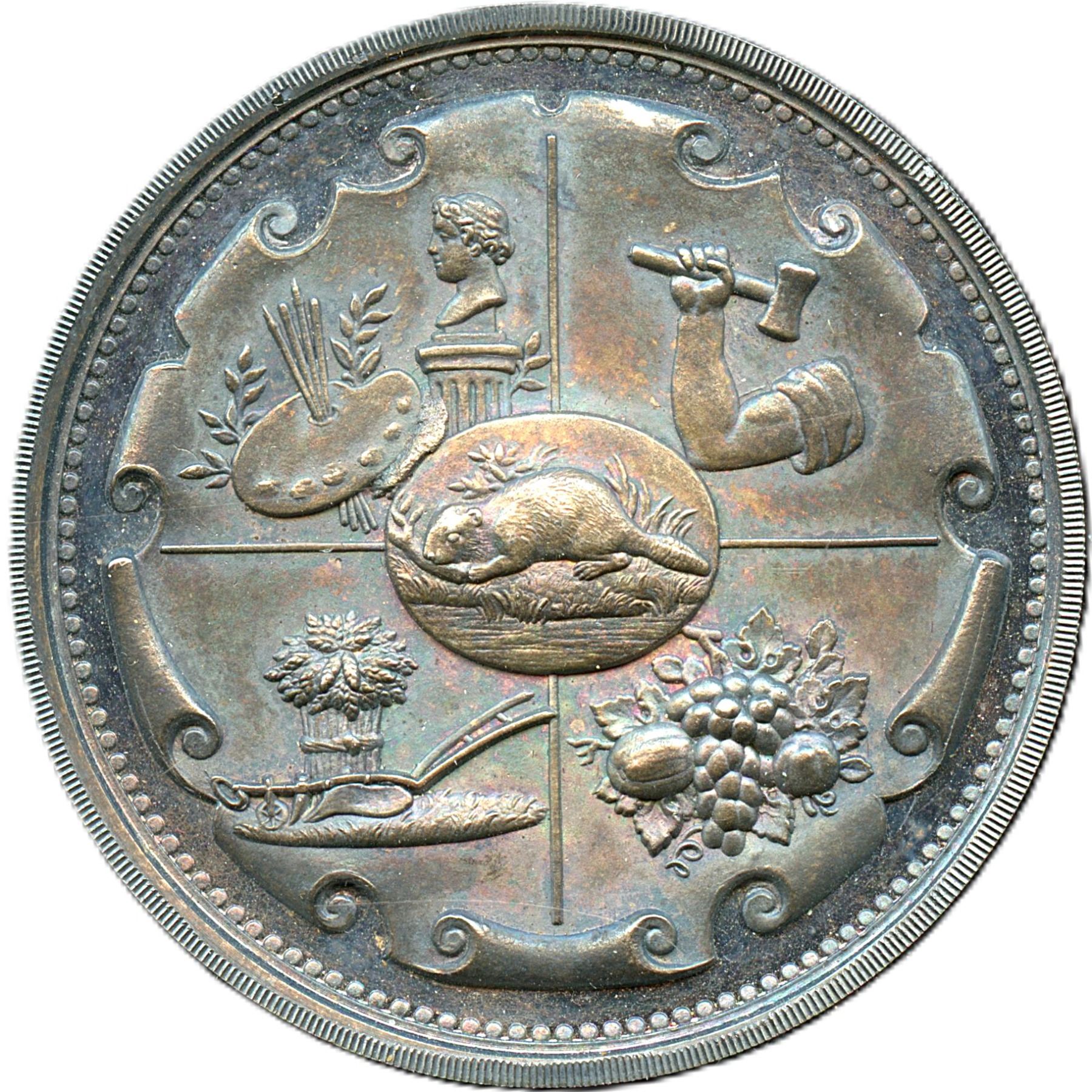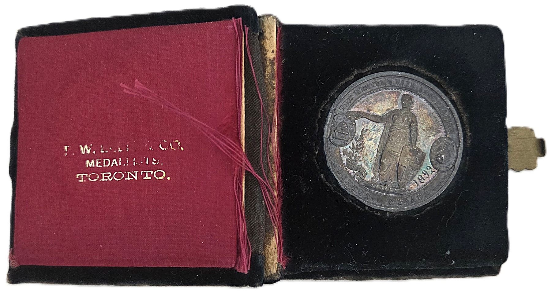 38.0mm, 28.7g, Signed P.W. Ellis & Co. Toronto, Original surfaces with gold and violet patina over reflective fields. A glossy and unworn medal with only a few tiny marks, Rim cud at 9 o'clock, Housed in its original black velvet wooden box with black velvet interior, box is in rough condition, UNC. 1pc. From the Geoffrey Bell Collection.