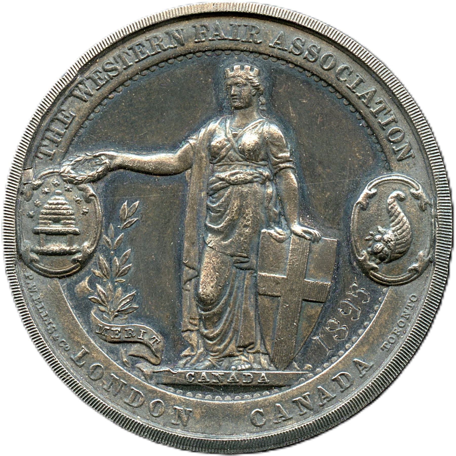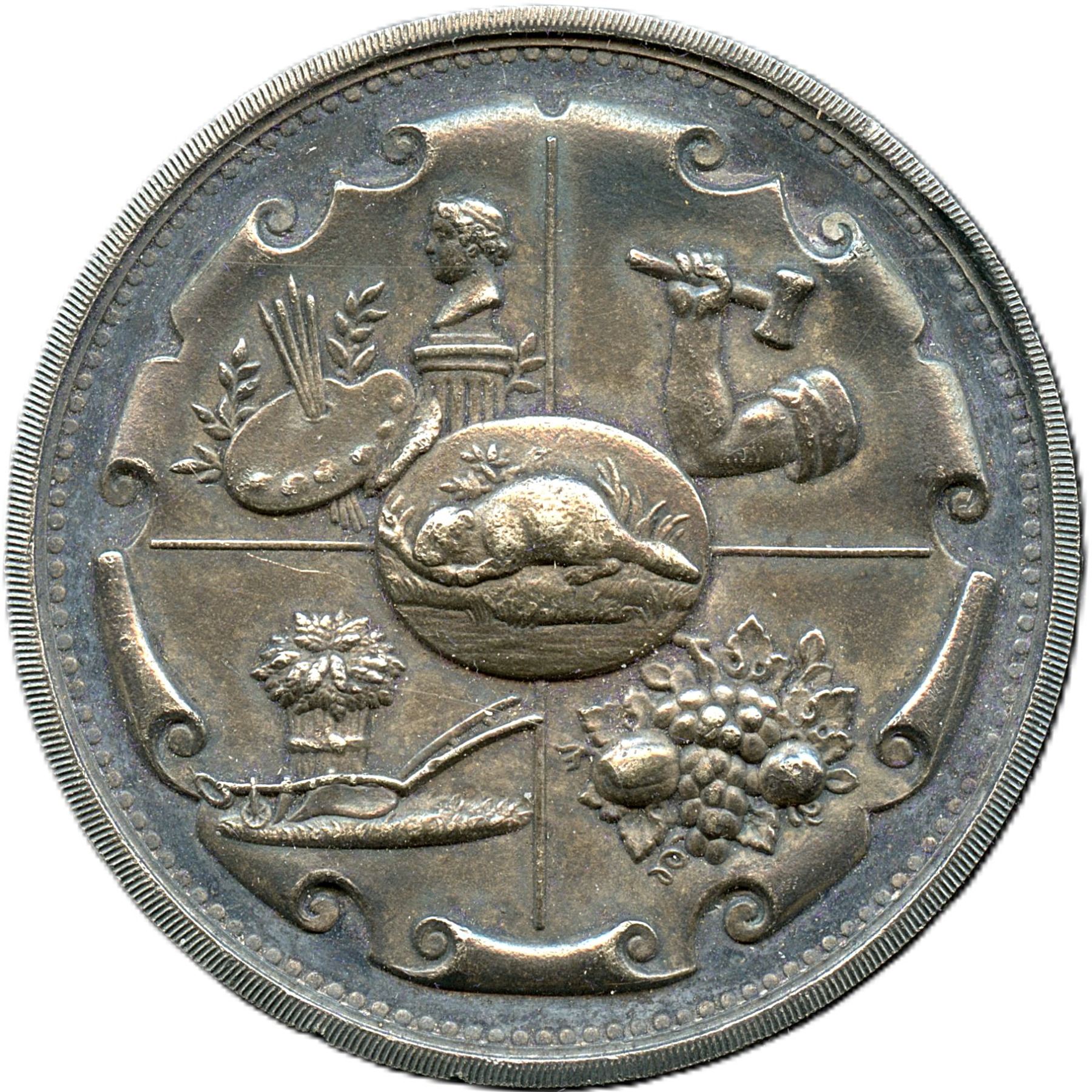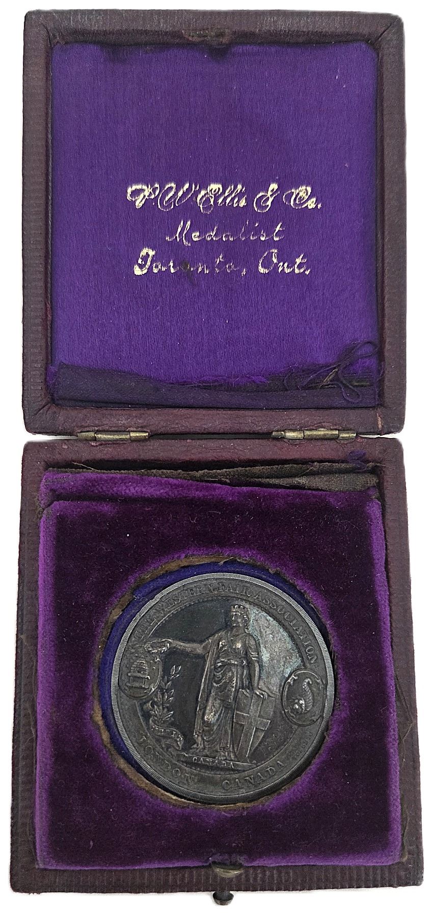 38.0mm, 28.1g, Signed P.W. Ellis & Co. Toronto, Minimal wear on high points, Housed in its original burgundy leather wooden box with purple velvet and purple silk interior, box is in fair condition. EF. 1pc. From the Geoffrey Bell Collection.