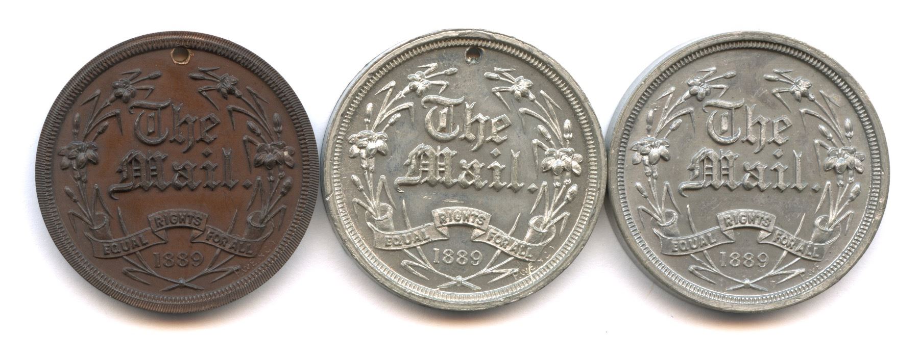 Charlton-5240. Lot of three (3). Each 30.0mm with plain edges and signed by P.W. ELLIS & CO. 1.) Copper. 11.71g. Superb deep brown, glossy surfaces. Holed at 12 o’clock, as usual. 2.) Aluminum. 7.47g. Holed at 12 o’clock. Brilliant Unc. 3.) Aluminum. 10.46g. Unholed and rare as such. Condition is similar to last.