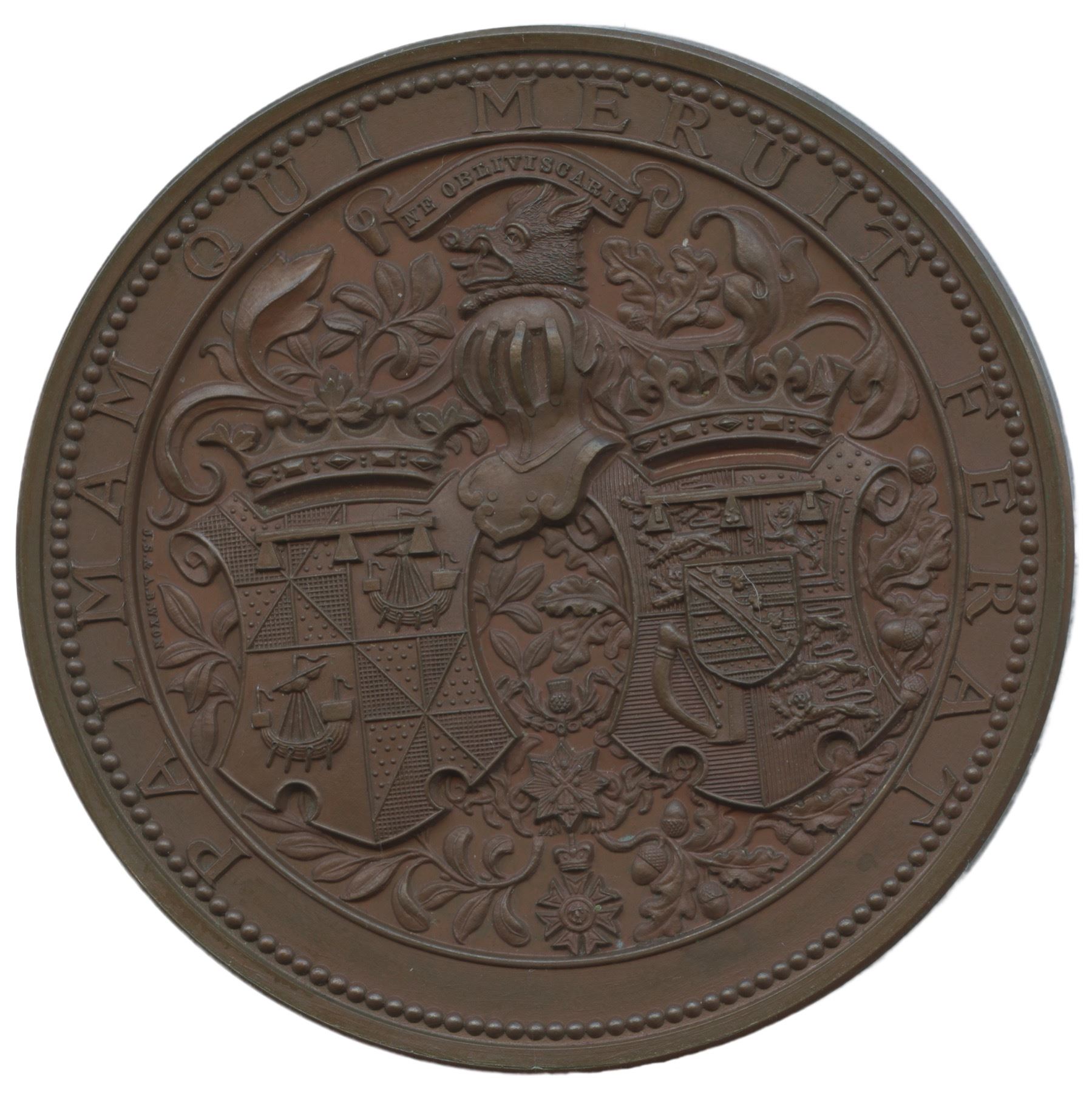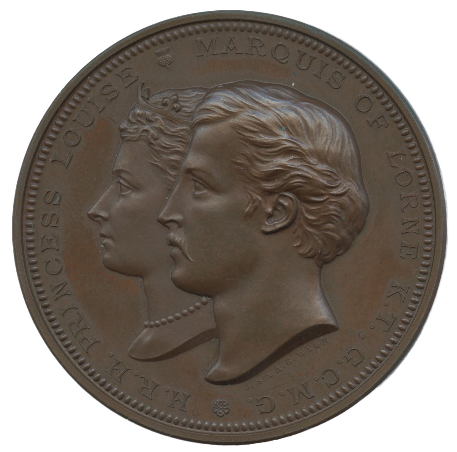 McLachlan-481, Breton-94, Clowery-103. 51.3mm. 72.5g. Plain edge. Signed J.S. & A.B. WYON. John Campbell, 9th Duke of Argyll, served as Governor General from 1878 to 1883. This unnamed copper medal is one of an estimated 300 pieces distributed. Each side is deep brown with splashes of red patina. No obvious high-point rub or contact marks, though we note a few specks of aqua residue.From the Michael Joffre Collection of Canadian Historical Medals.