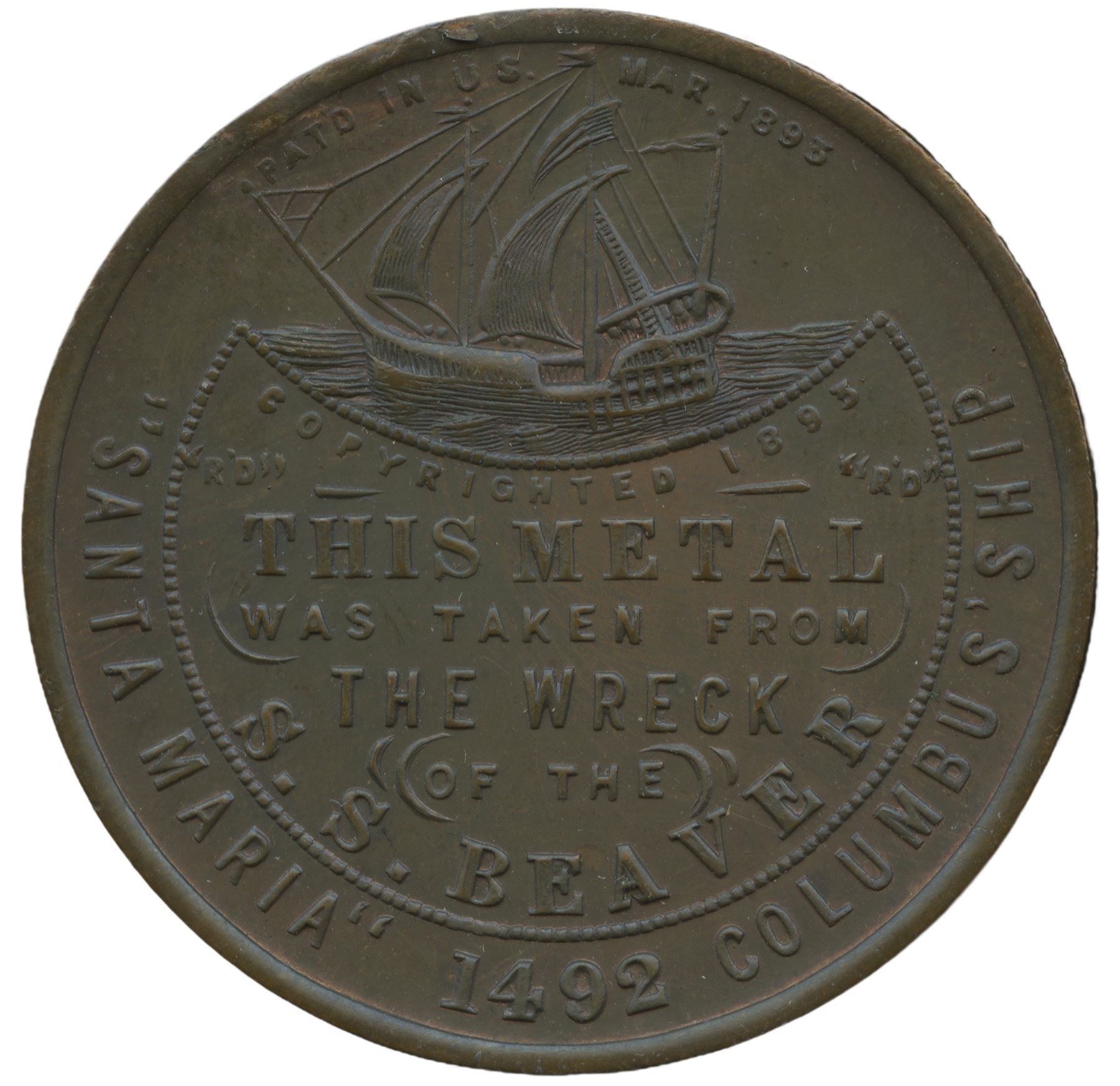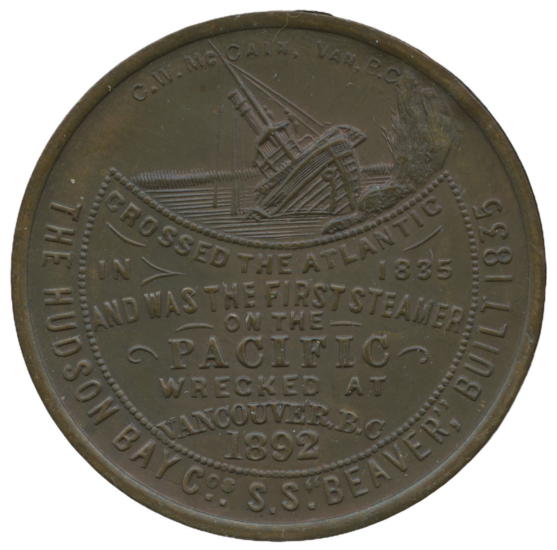 Charlton-6045-5. 35.5mm. 19.2g. 448 stamped on edge. Signed C.W. MCCAIN. The third issue in the S.S. Beaver series. Examples known in bronze, aluminum, and white metal. Both sides are slightly muted with blue and violet patina. Traces of red around the devices. From the Michael Joffre Collection of Canadian Historical Medals.