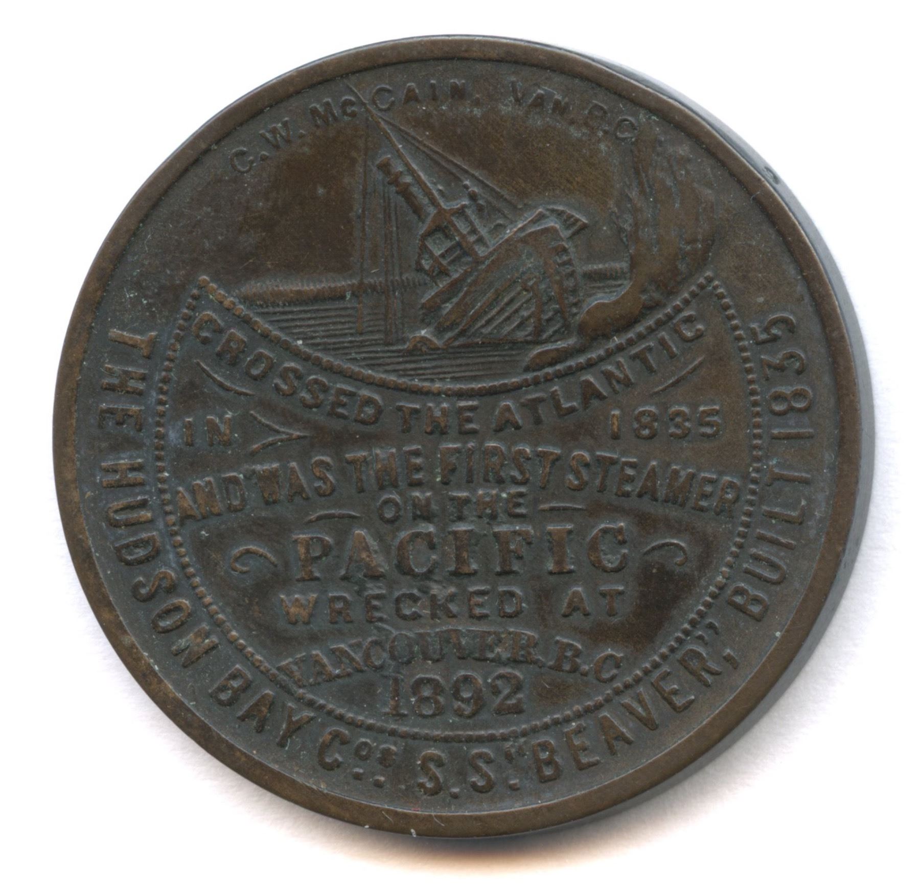 Charlton-6045-5. 35.5mm. 19.2g. 9 stamped on edge. Signed C.W. MCCAIN. The third issue in the S.S. Beaver series. Examples known in bronze, aluminum, and white metal.
