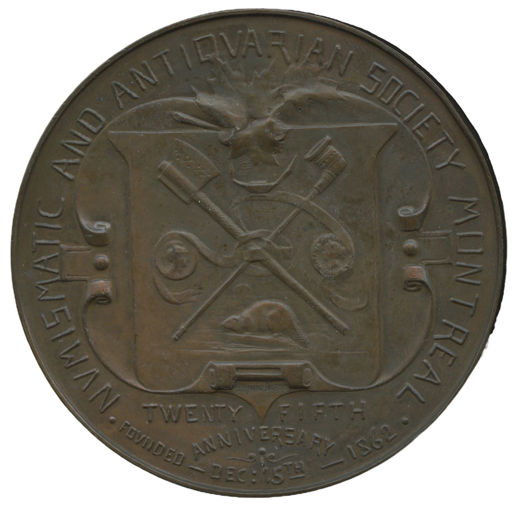 Lr. 1611 — Montreal Numismatic and Antiquarian Society 25th Anniversary - Justice Baby. 1887. Bronze. Breton-167, Charlton-2380-10. 60.2mm. 104.2g. Plain edge. Signed FERDINAND DUBOIS. Varying shades of golden-brown with pastel accents on the obverse, which may have been cleaned lightly at some point. Void of rim nicks or other distracting flaws.