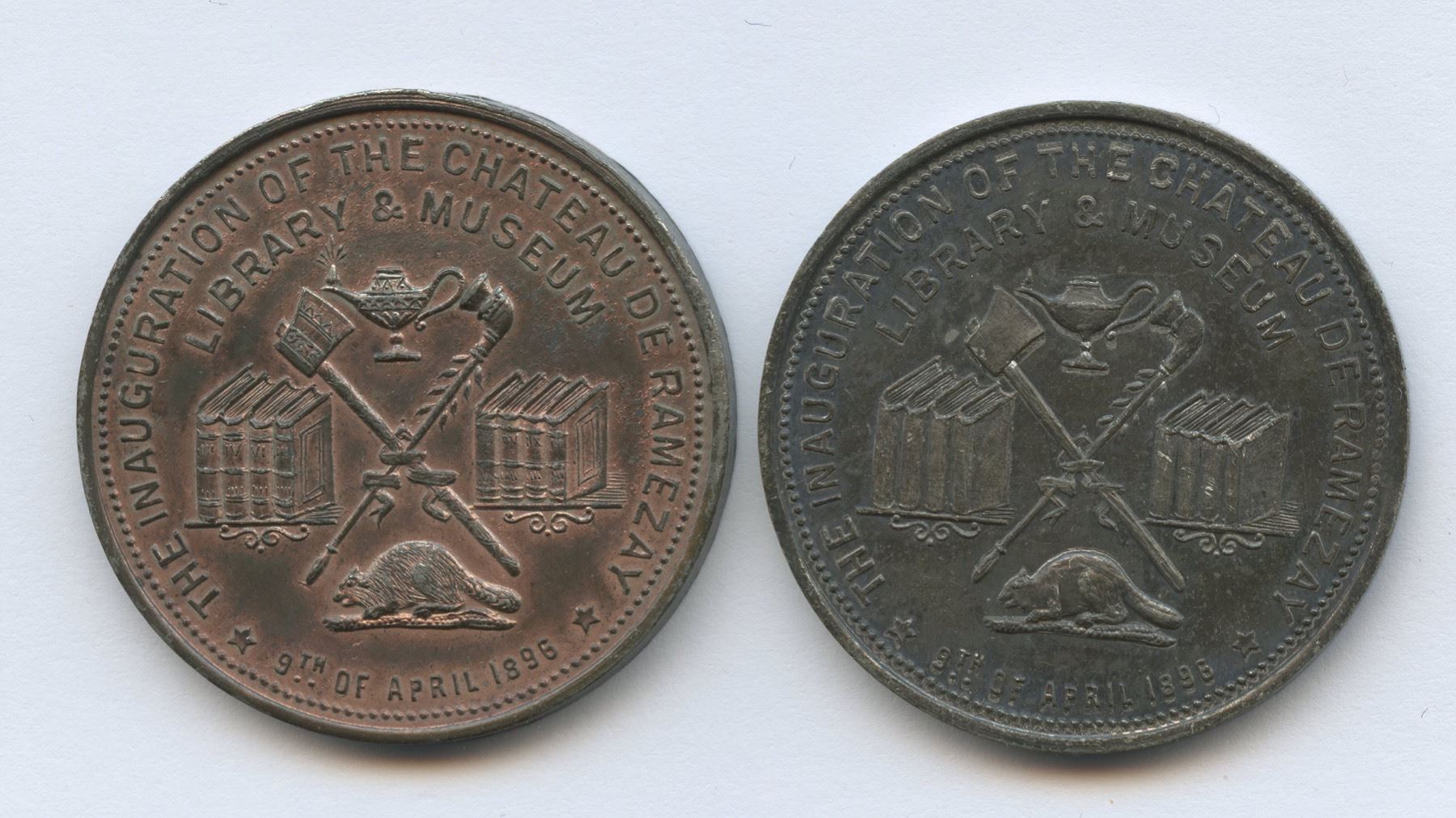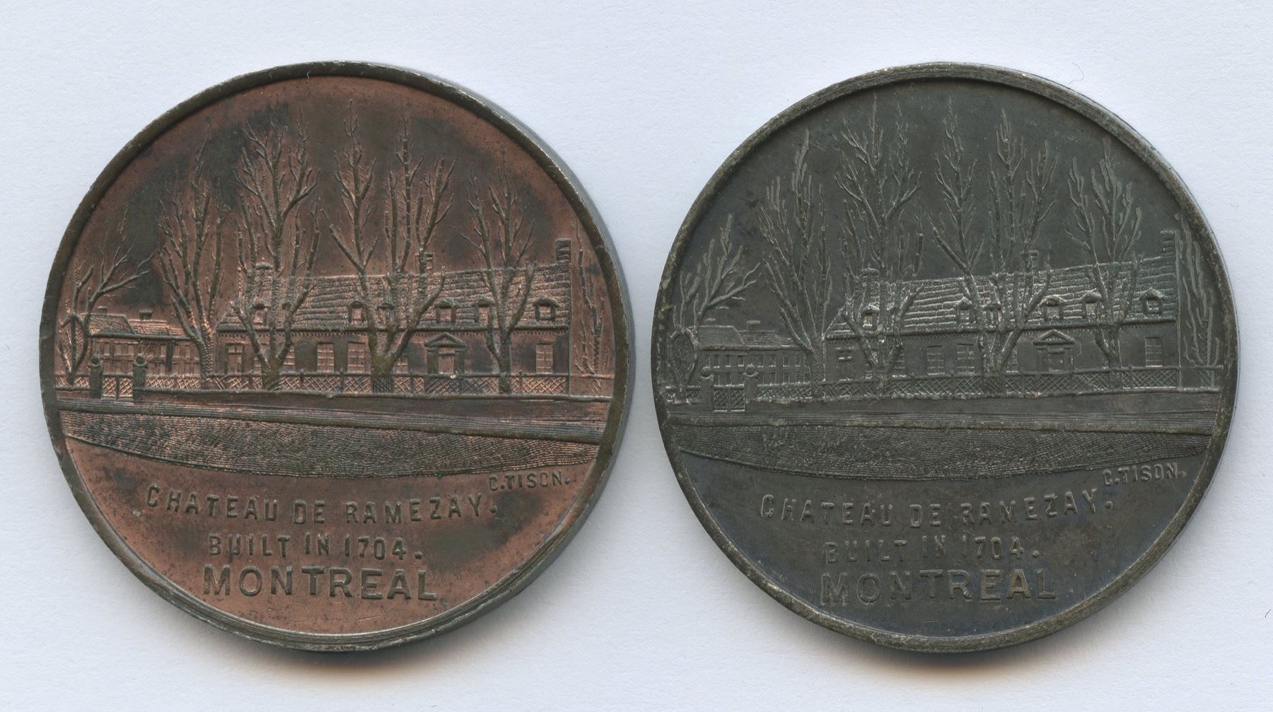 Lr. 1612b — Montreal Numismatic and Antiquarian Society - Inauguration of the Chateau de Ramezay Library and Museum. 1896. Copper and White Metal. Charlton-1595-20. Lot of two. Each 33.4mm with plain edges and signed C. TISON. 1.) Copper. 10.8g. Coinage alignment. Substantially red and lustrous with splashes of blue and violet patina. 2.) White metal. 10.7g. Medal alignment. Nicely toned with attractive gunmetal-blue and olive-green hues.