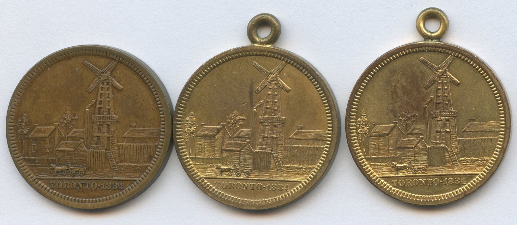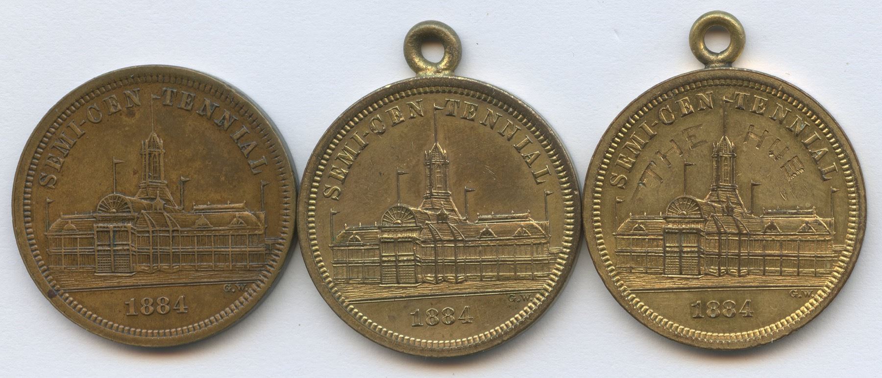 Charlton-EONS-93. Lot of three. Each 39.1mm with plain edges and signed G.W. 1.) 6.7g. Glossy olive-gold surfaces. 7.4g. Loop attached at 12 o’clock. Flashier brassy-gold surfaces. 3.) 7.3g. Loop attached at 12 o’clock. Similar to last, but engraved THE HUB in the field above the convention hall.