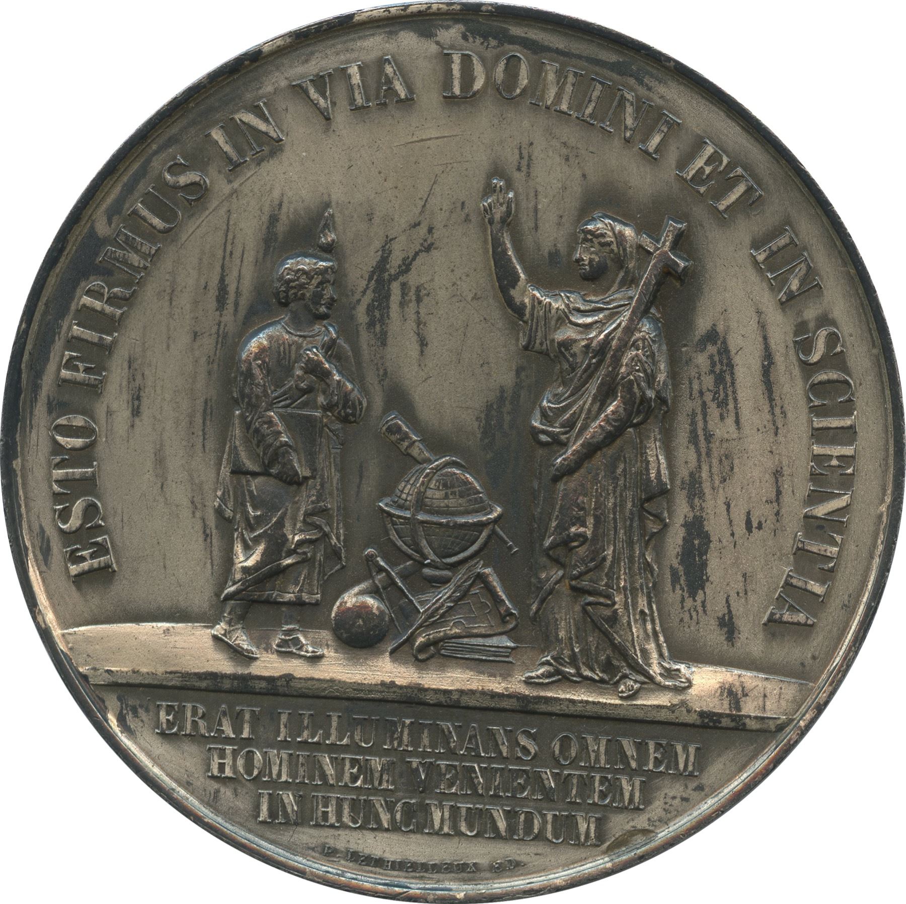 Breton-149. 52mm. 67.5g. Edge engraved DONNÉE PAR LE RÉV. PÈRE J.N. DOZOIS, O.M.I. MERITÉE PAR L.P. CORNELLIER IV 8, 1910. Signed P. LETHIELLEUX. Another named University of Ottawa silver medal. This one features more of a matte surface that alternates between silver-grey and deeper charcoal patina. Clearly struck later than the previous two pieces, with faint die cracks.