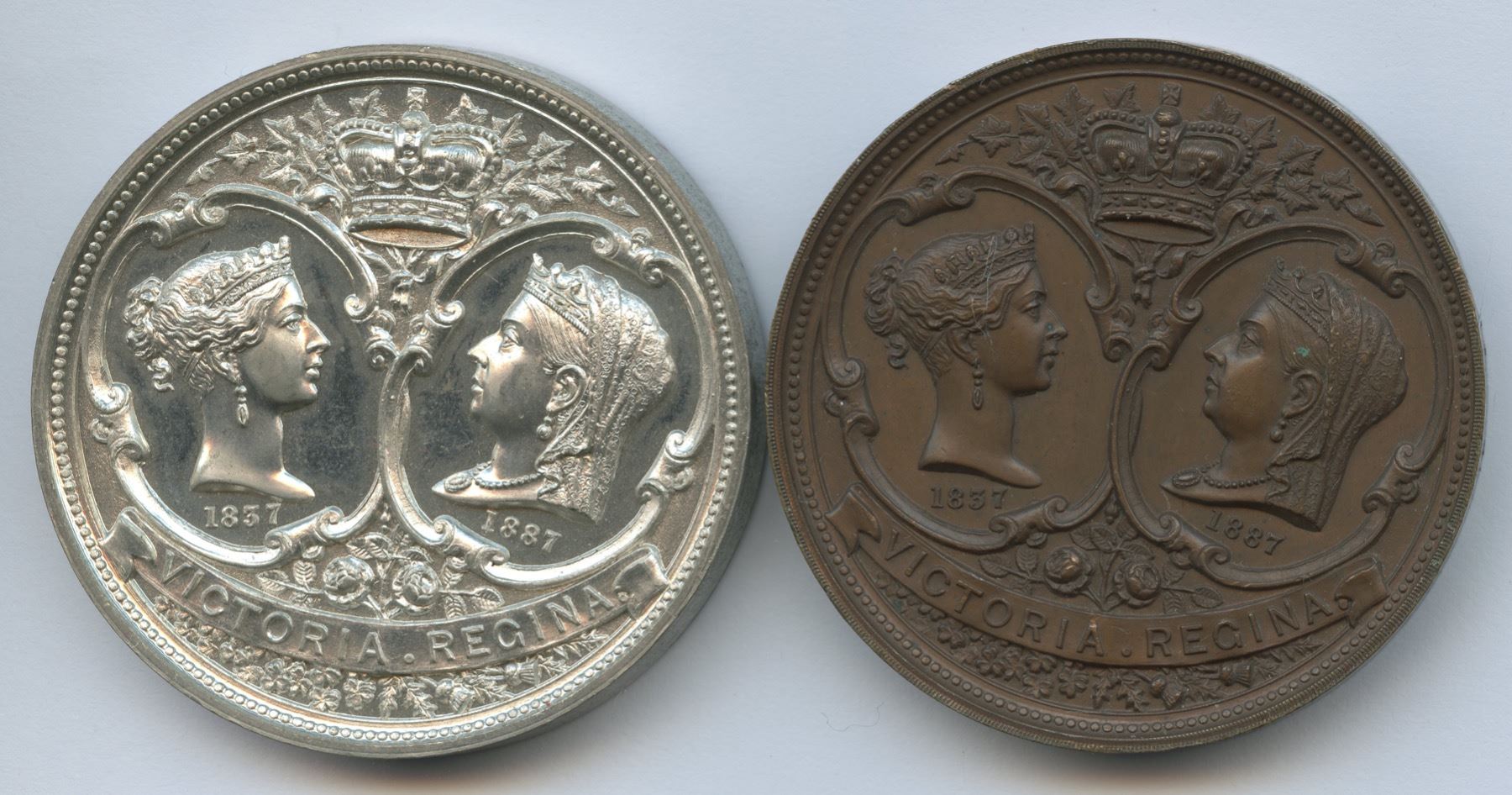 Lot of two medals. Each 45mm with plain edges and signed P.W. ELLIS & CO. Struck in celebration of Queen Victoria’s 50th year on the throne. 1.) Copper. 53.0g. Slightly muted red-brown surfaces. Little trace of wear. 2.) White metal. 38.1g. Fully brilliant with dramatic cameo contrast between the watery fields and frosted devices. Terrific eye appeal.