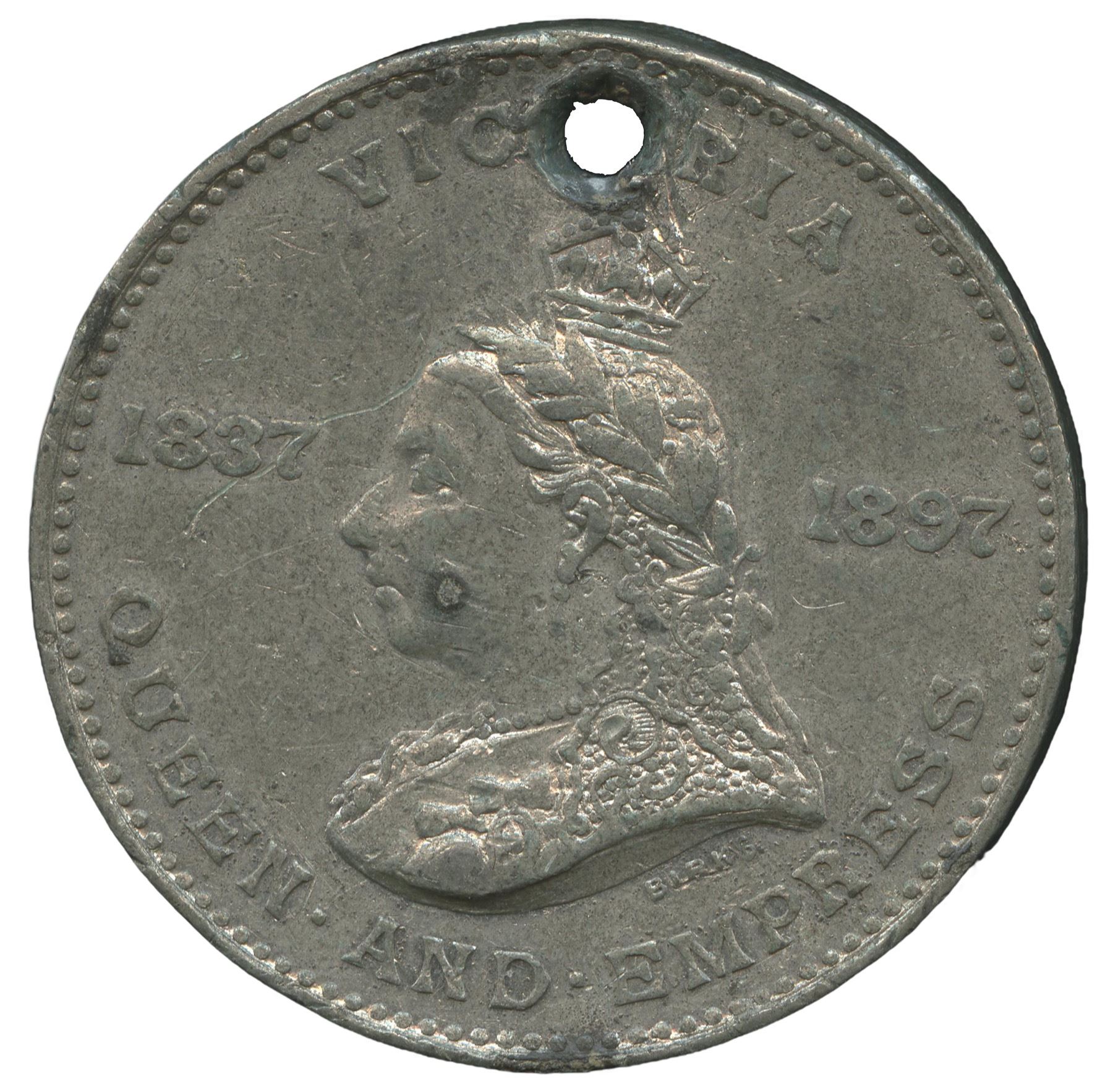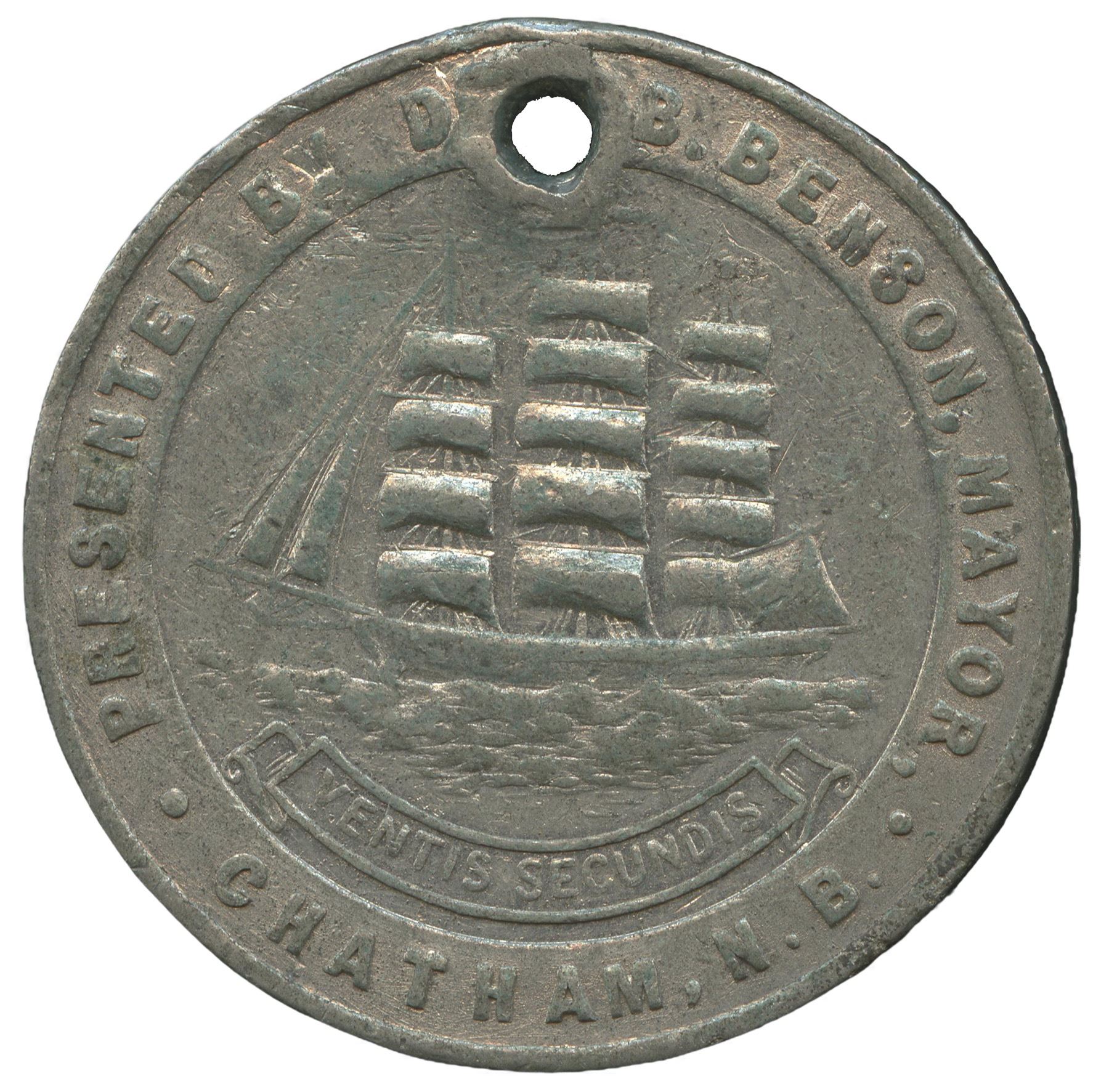 30mm. 13.8g. Plain edge. Signed BIRKS. Holed at 12 o’clock. A seldom seen souvenir medal issued by Chatham, New Brunswick mayor Dr. J.B. Benson. This example was worn and enjoyed. The fields remain partly flashy, though the surfaces are largely subdued. From the Michael Joffre Collection of Canadian Historical Medals.