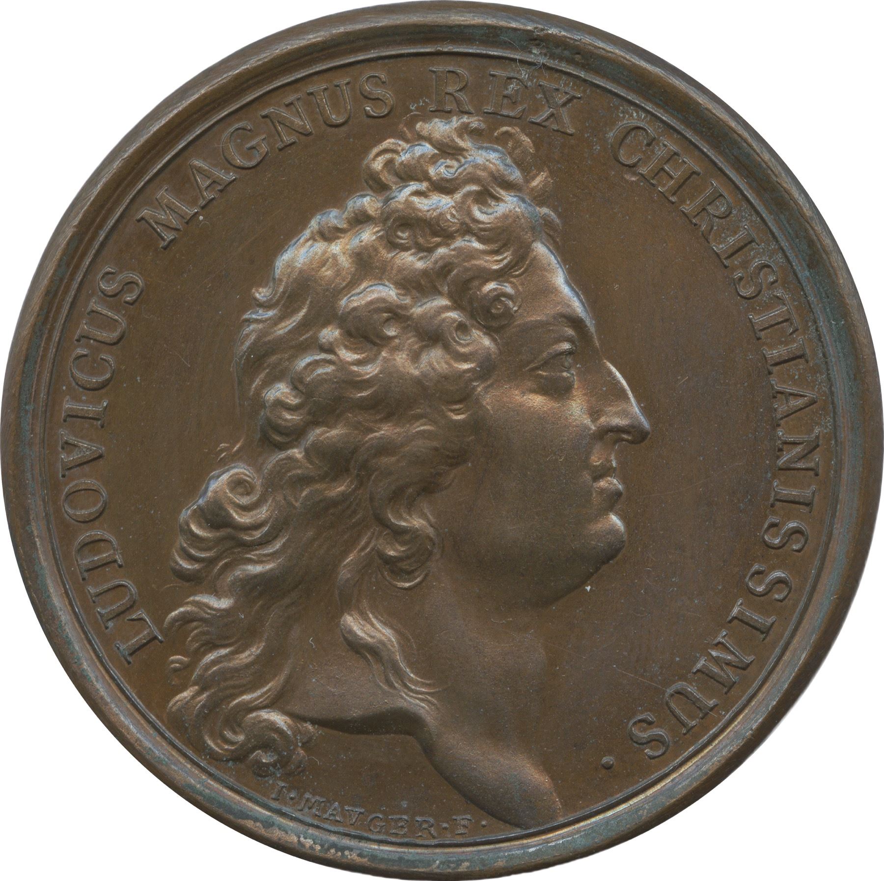 Betts-76. Breton-6. 41.4mm. 31.3g. Plain edge. Signed I. MAUGER. A glossy, rich chocolate-brown example of this small-size Dynastic medal. Both sides feature minor planchet imperfections, but the semiprooflike surfaces are essentially void of friction. Struck with rounded rims typical of the period. A noticeable rim break occurs at 3:30 on the reverse. Betts-76 has long been collected as part of the Indian peace medal and Canadian series. However, numismatist David Fanning presents a strong argument that these medals were produced not for diplomatic purposes, but rather to celebrate the birth of Charles, Duc de Berry. They were likely struck circa 1691 to 1693 and served as the inspiration for the 1693 Dynastic medals, which were, in fact, given out to the Indigenous peoples of North America. A comparable Choice Uncirculated example sold recently as part of the Donald G. Partrick Collection (Heritage, 3/2021), realizing $1,260 USD.