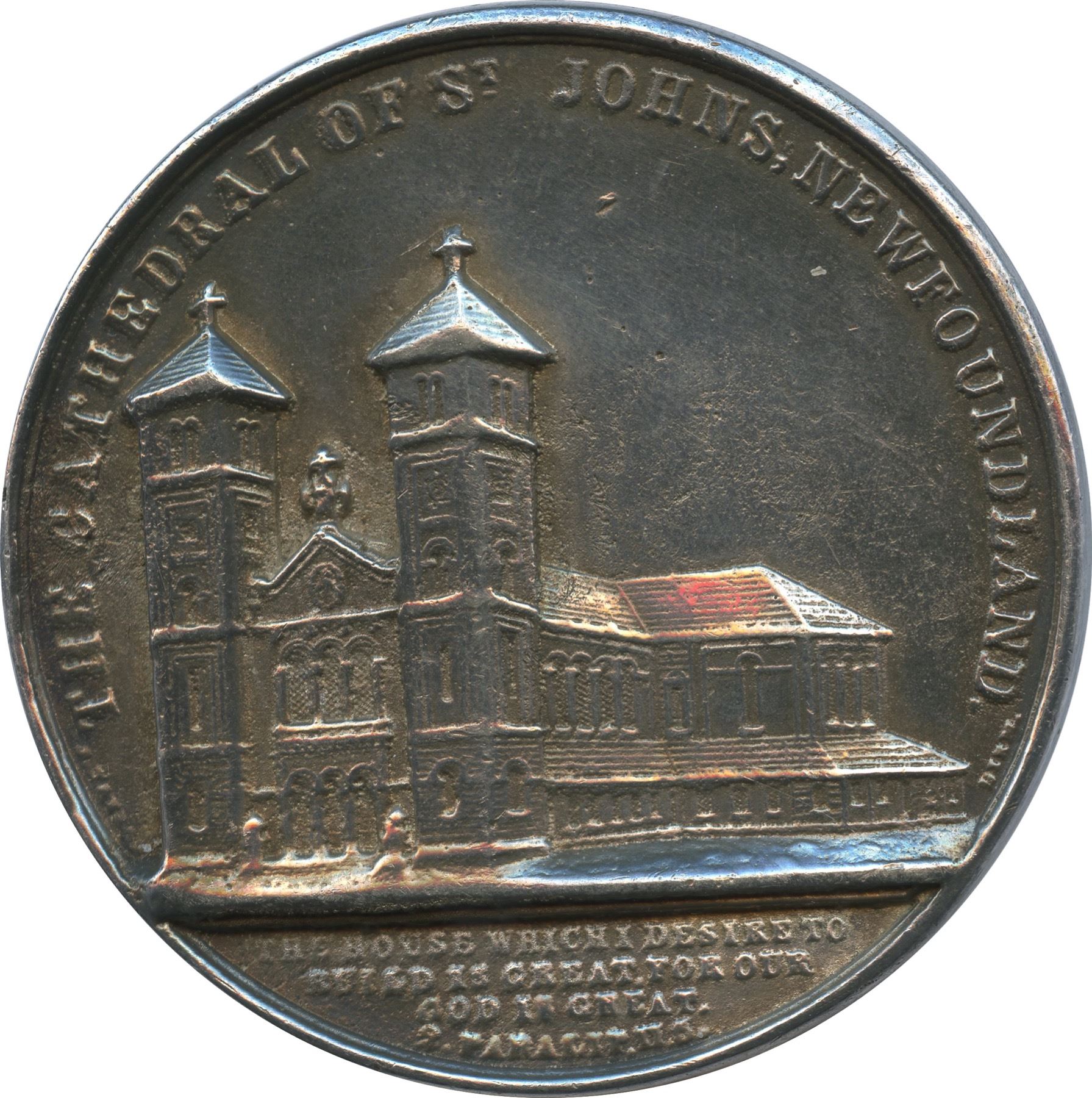 McLachlan-540, Breton-179. 53mm. 58g. Plain edge. Signed J. Taylor. This medal commemorates the laying of the cornerstone of the Basilica-Cathedral of St. John the Baptist in St. John’s, Newfoundland on May 21, 1841. Examples exist in both white metal (usual) and silver. They can be found either struck or cast. This is a rare cast silver medal with as-made roughness. Gold and gunmetal patina covers each side. A very rare early Canadian medal in this composition.