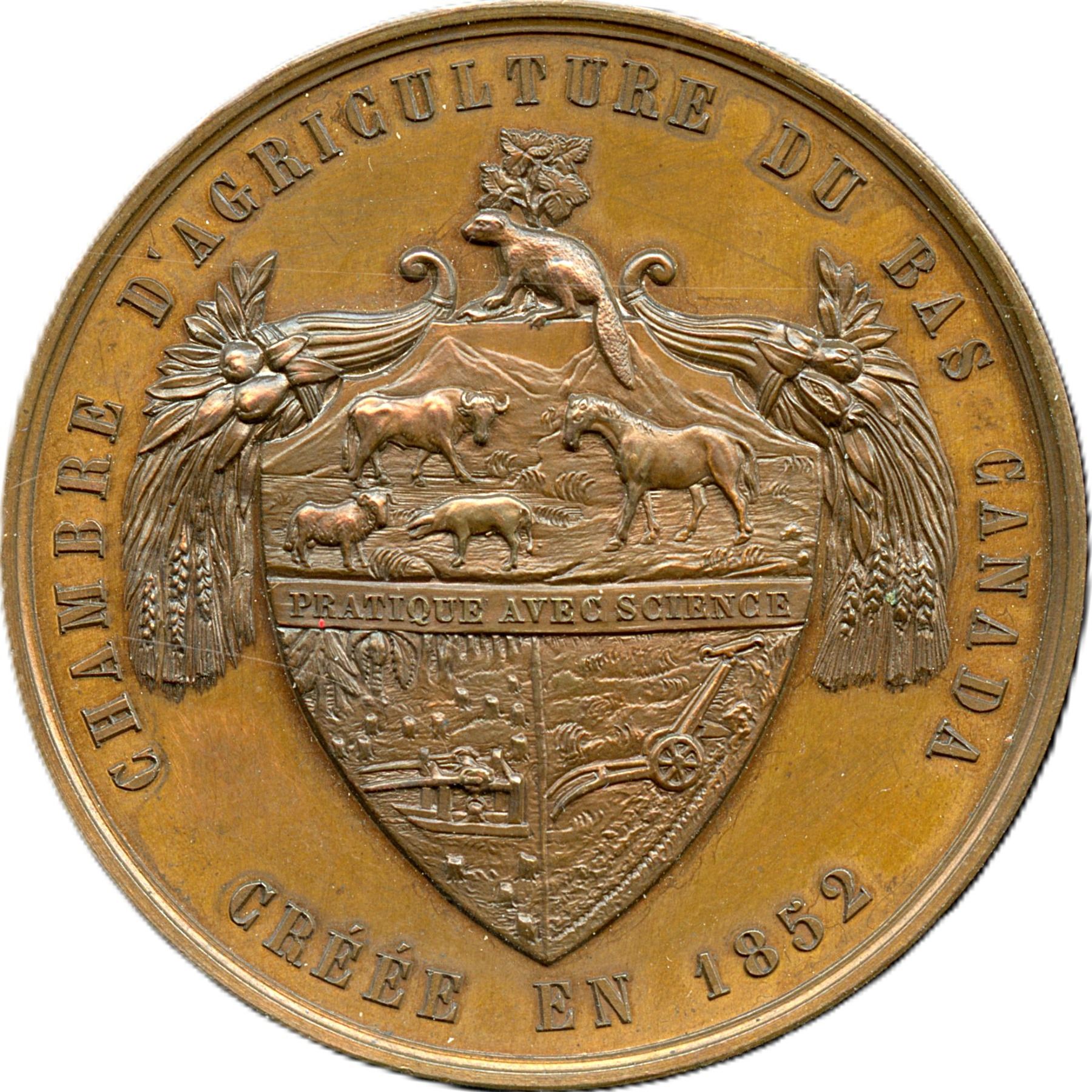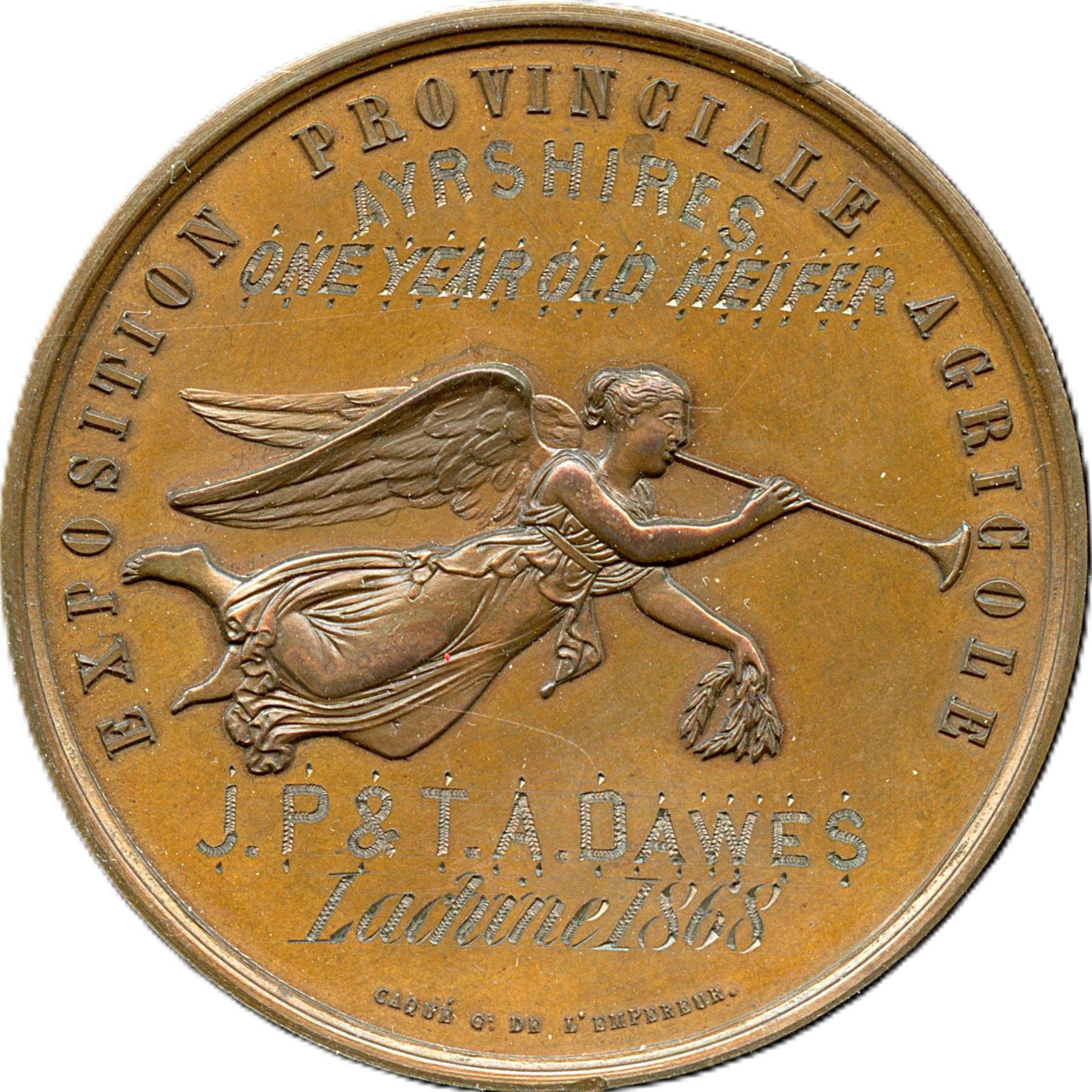 Bee hallmark and CUIVRE stamped on edge, 41.5mm, 38.3g, Signed Caque Cr. de L'Empereur, Awarded to: "Ayrshires One Year Old Heifer J.P. & T.A. Dawes Ladune 1868", A glossy and unworn medal with only a few tiny marks and one rim nick. UNC. 1pc. From the Geoffrey Bell Collection.