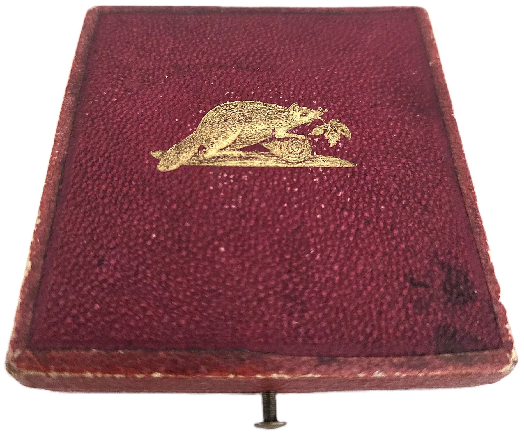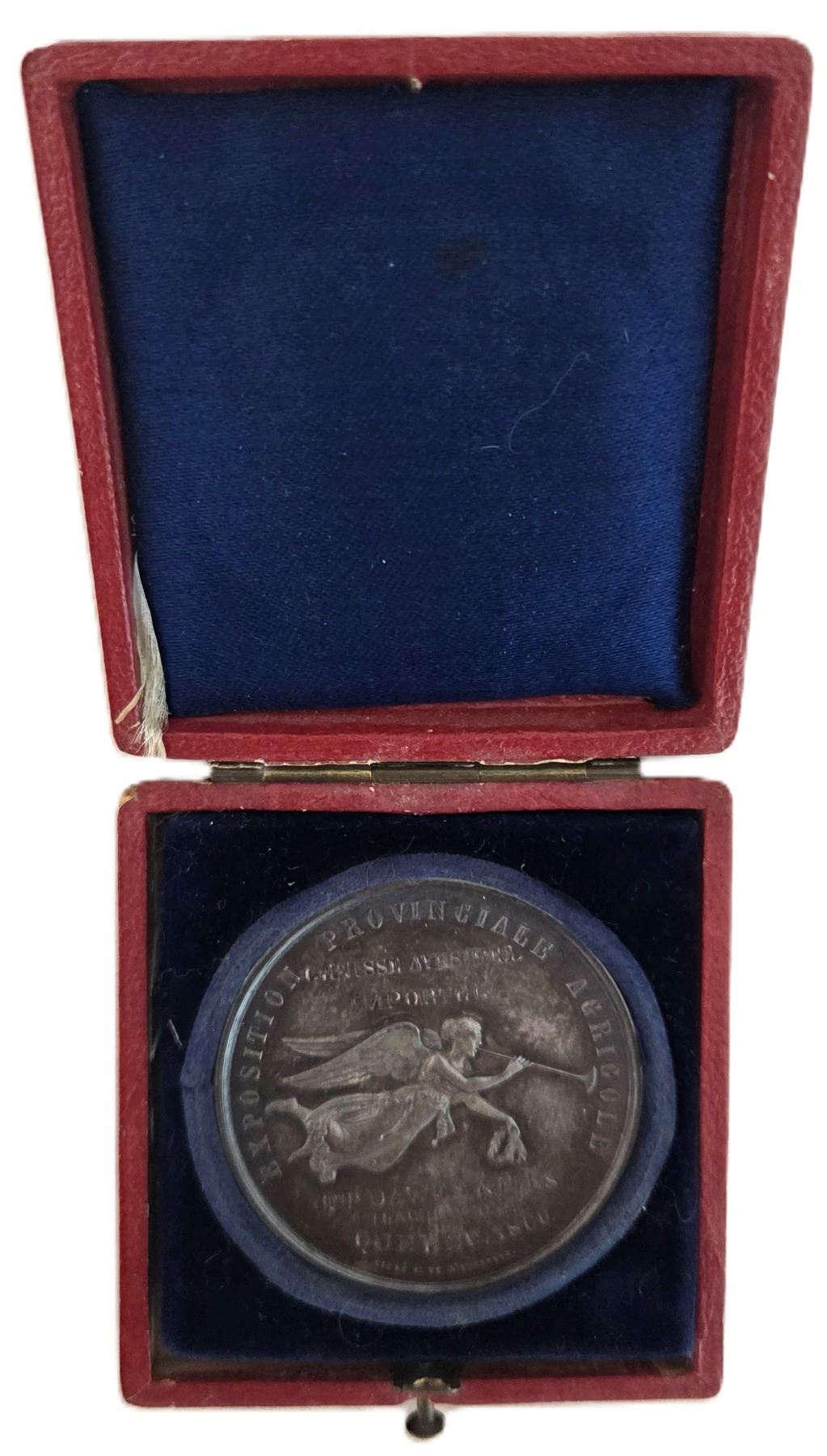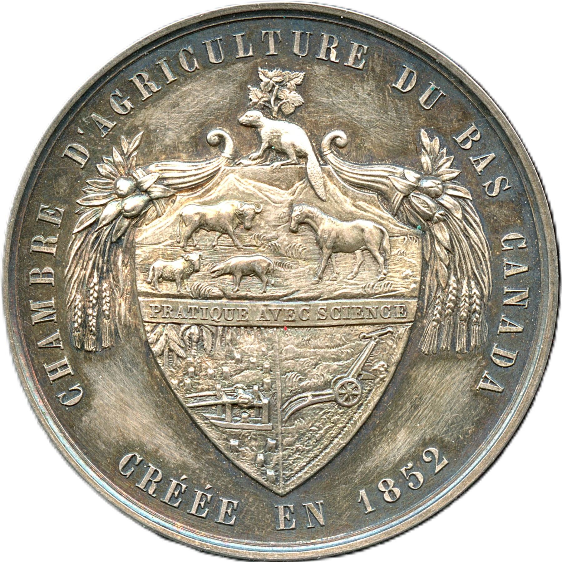 Bee hallmark and ARGENT stamped on edge, 41.5mm, 36.7g, Signed Caque Cr. de L'Empereur, Awarded to: "Genisse Ayrshires Importee Ths Dawes (Lachine C.E.) Quebec 1860", Original surfaces with violet patina over reflective fields. A glossy and unworn medal with only a few tiny marks. Housed in its original red box with embossed gold beaver on the top with blue velvet and blue satin interior. UNC. 1pc. From the Geoffrey Bell Collection.