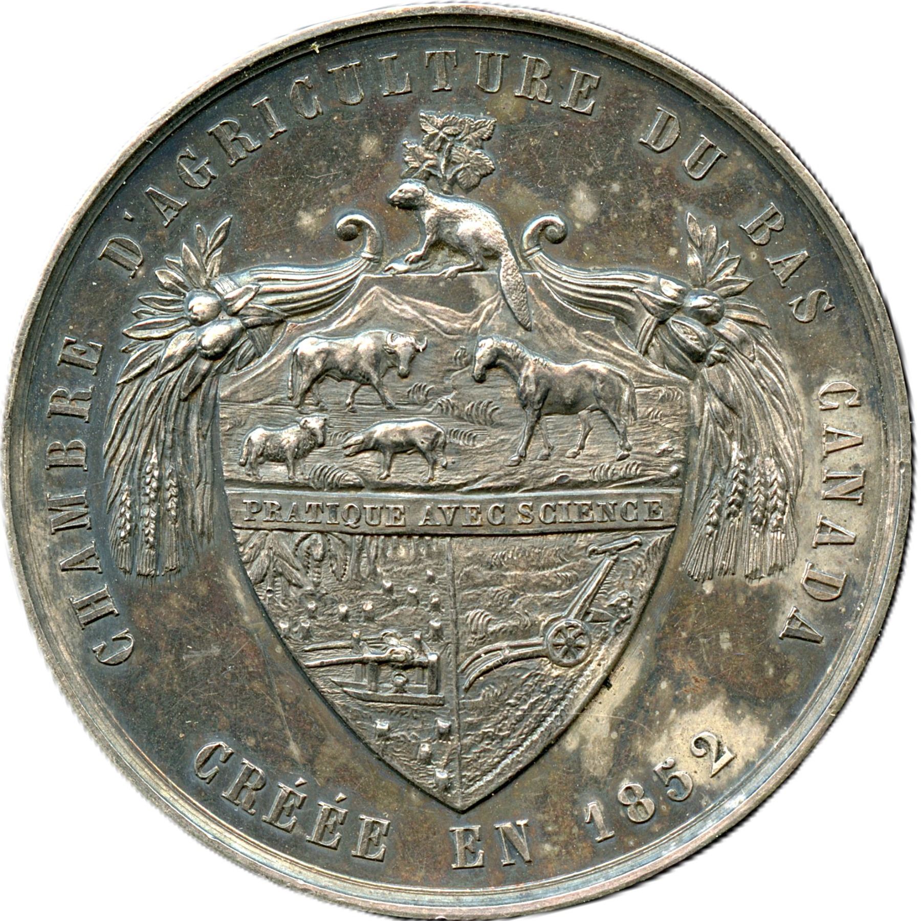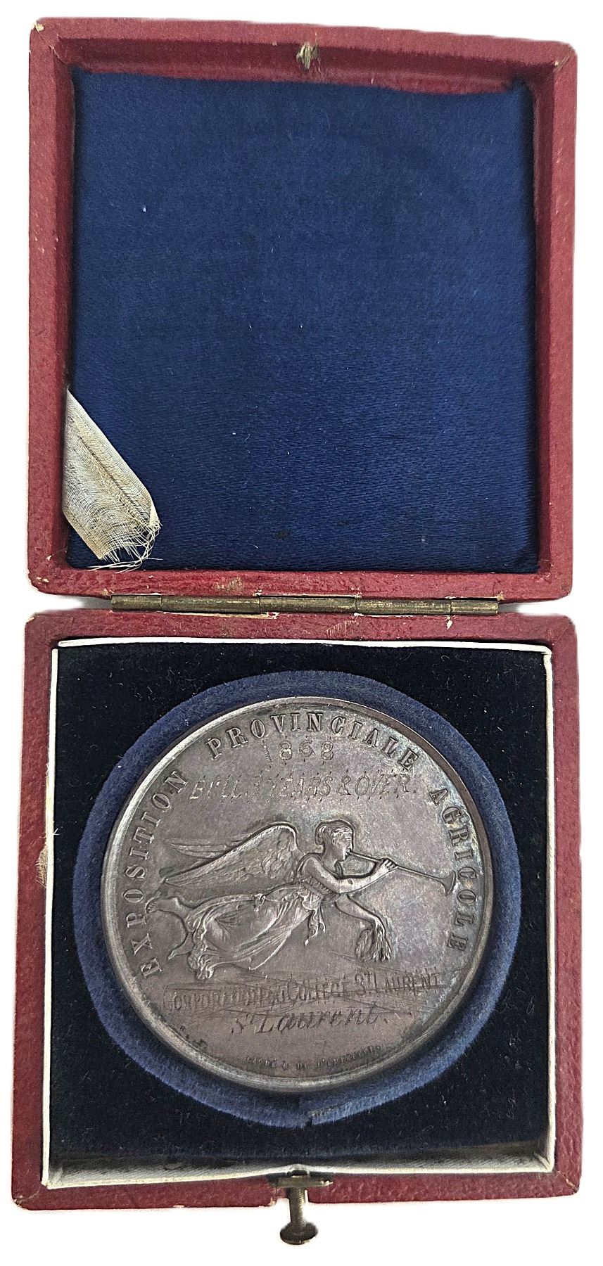 Bee hallmark and ARGENT stamped on edge, 41.5mm, 37.9g, Signed Caque Cr. de L'Empereur, Awarded to: "1868 Bull 3 Years & Over Corporation du College St. Laurent St. Laurent", Heavy scratches in an attempt to remove "Corporation du College St. Laurent". Still a nice medal. Housed in its original red box with embossed gold beaver on the top with blue velvet and blue satin interior. EF. 1pc. From the Geoffrey Bell Collection.