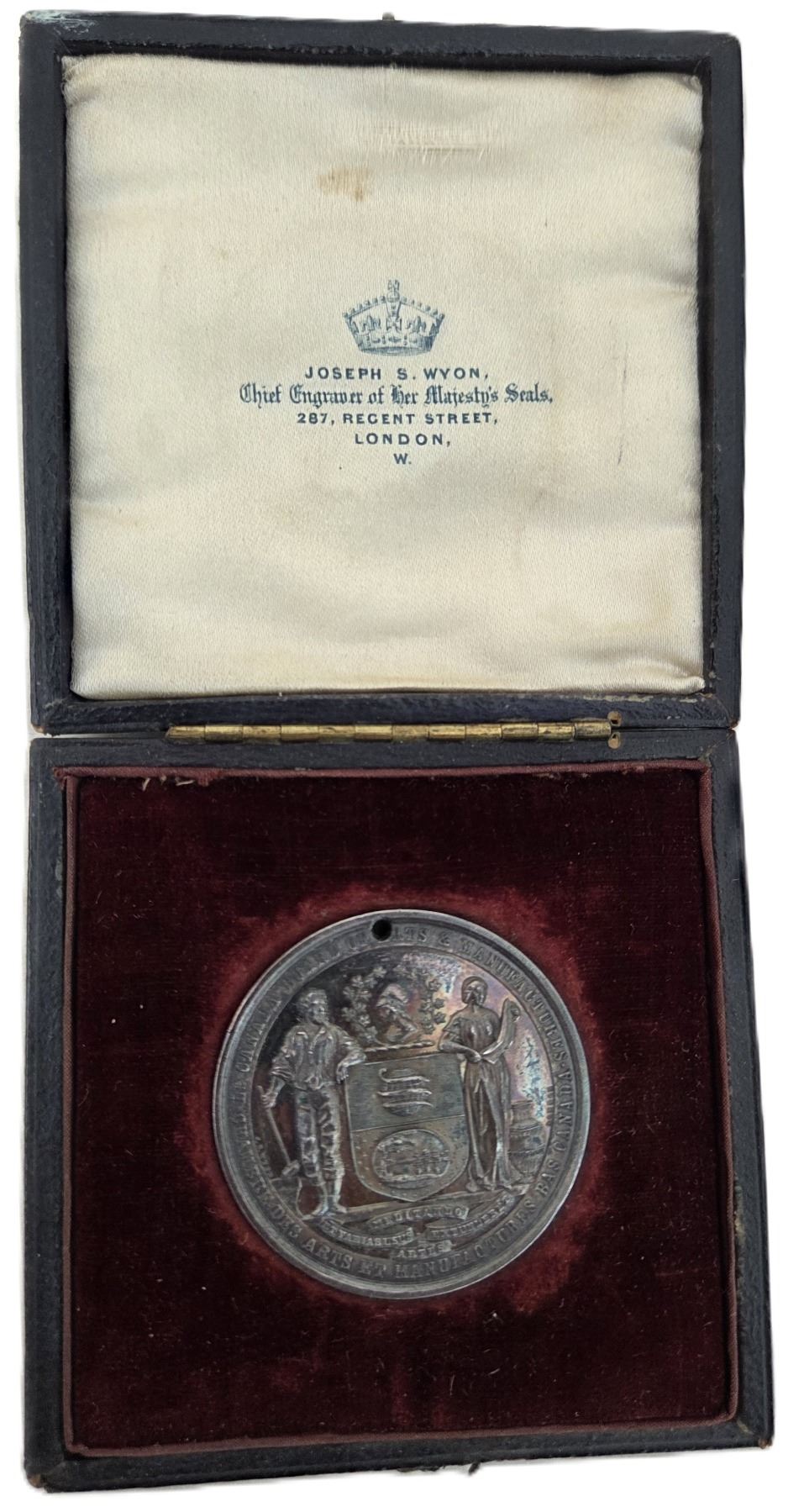 37.8mm, 33.2g, Signed J.S. Wyon, Not Awarded, Holed for suspension, Original surfaces with violet patina over reflective fields. A glossy and unworn medal with only a few tiny marks. Housed in its original Joseph S. Wyon black leather box with burgundy velvet and white satin interior. UNC. 1pc. From the Geoffrey Bell Collection.