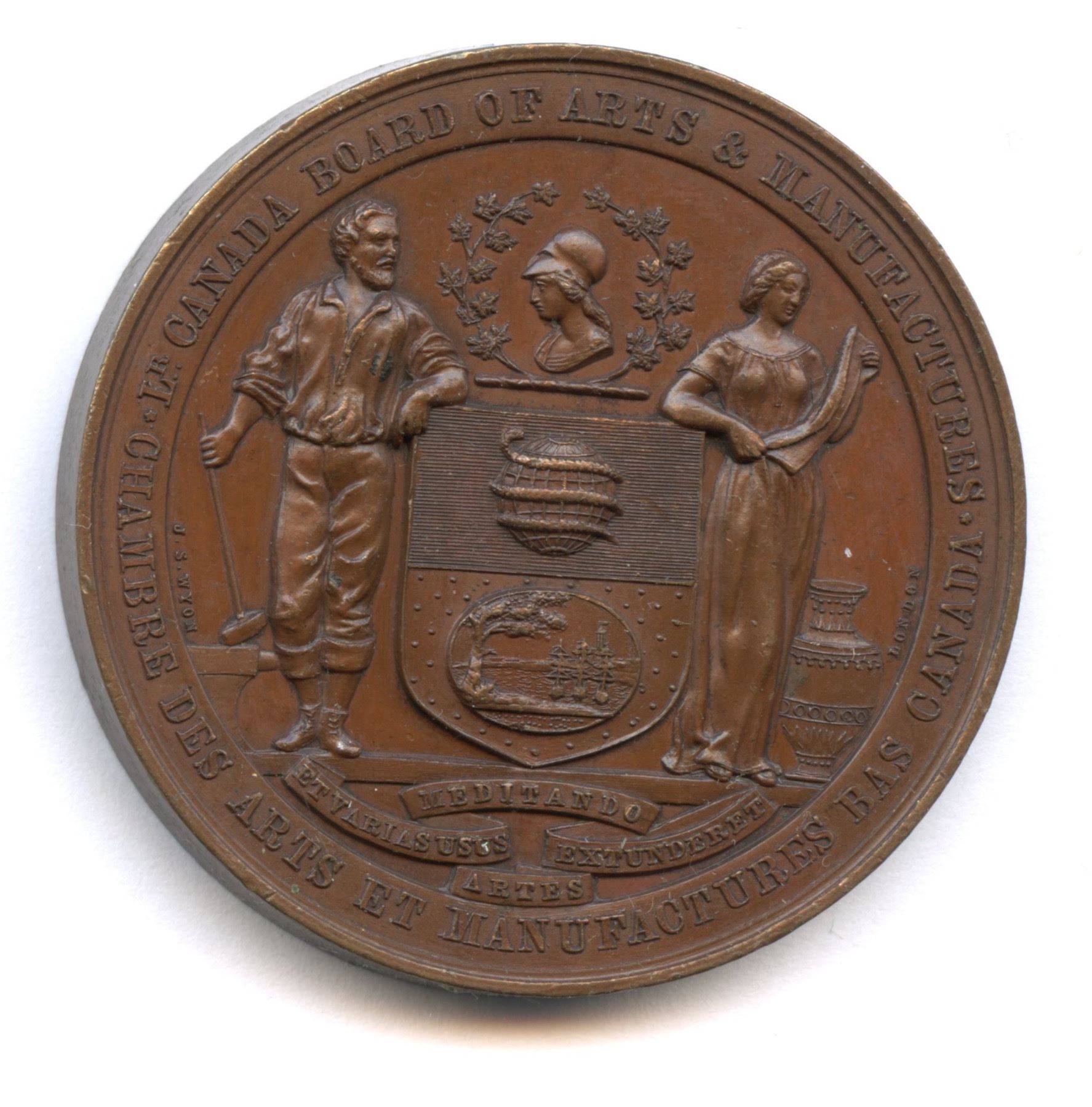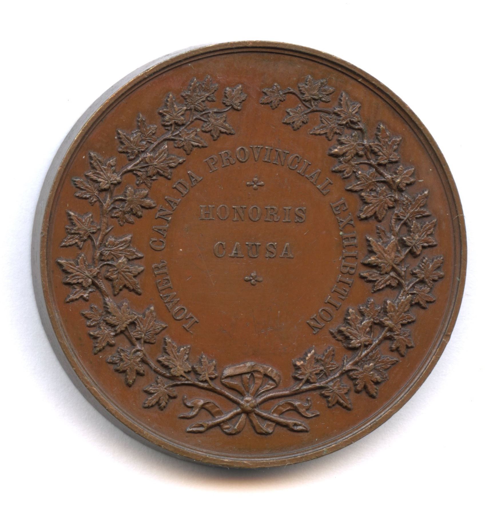 McLachlan-142. 38.2mm. 30.00g. Plain edge. Signed J.S. WYON. The obverse is as last, but the reverse is different. Writing in Canadian Numismatics (1886), R.W. McLachlan explained the change: “It was decided that the Provincial Exhibition should be held annually in one of the larger towns or cities of the province. A new reverse die was ordered, and the appropriate inscription ‘honoris causa’ on the reverse of the Great Exhibition Medal of London, 1862, was adopted.” Glossy mahogany-brown surfaces display significant flashiness.