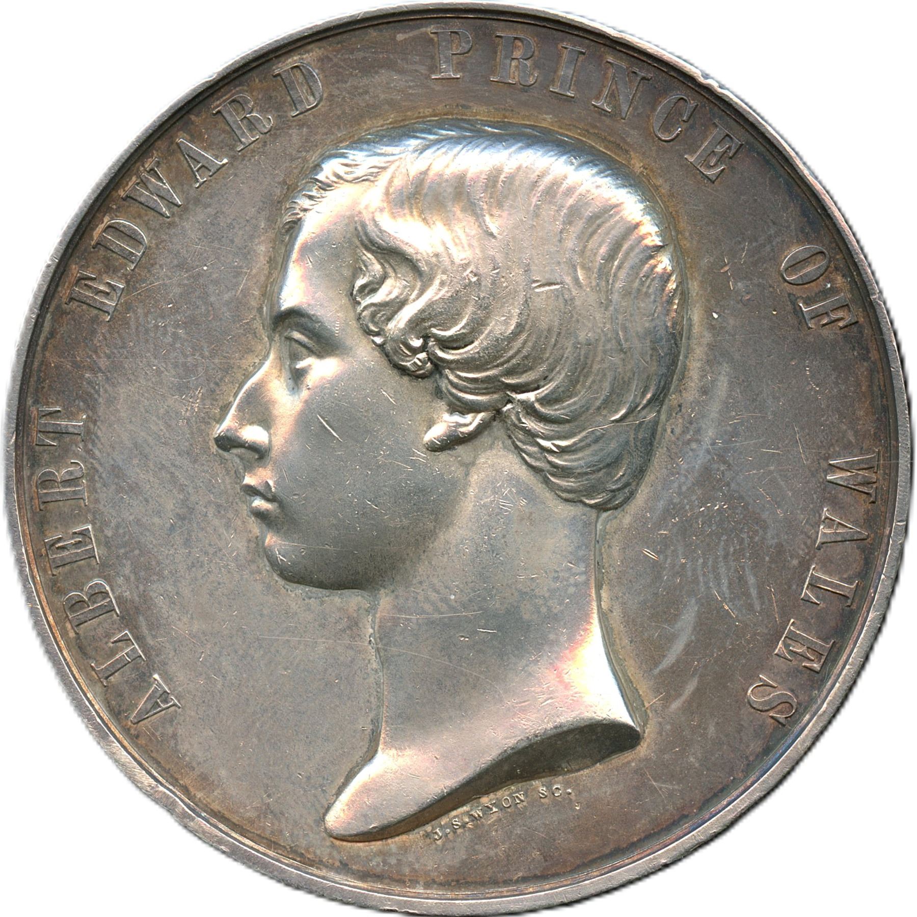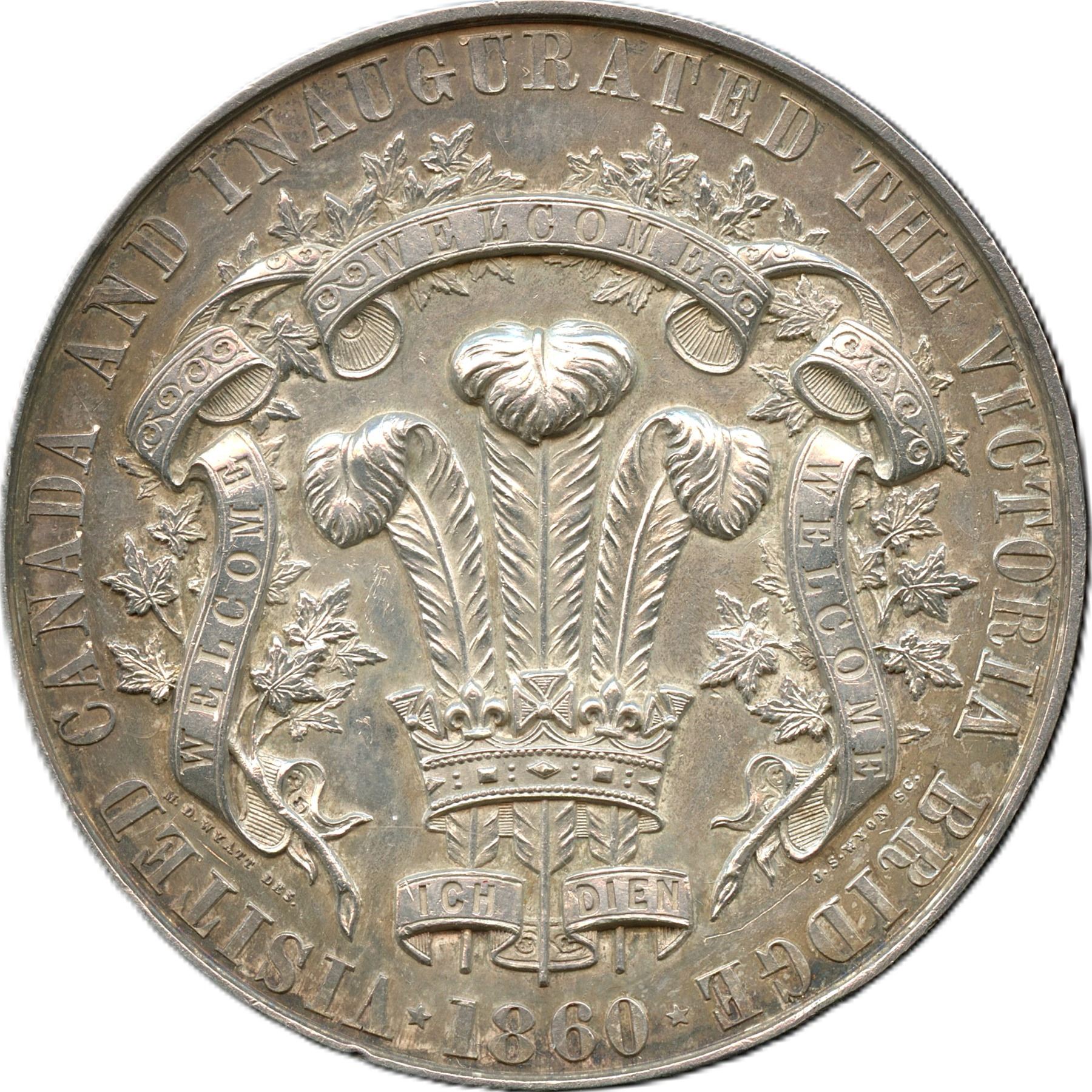 Br. 174, McLachlan 137. 48mm. 62.5g. Plain edge. Signed J.S. WYON. This is one in a series of medals issued to commemorate the Prince of Wales’ visit to Canada in 1860 for the opening of Victoria Bridge in Montreal. The design, with the Prince’s portrait on the obverse and his feathers on the reverse, was executed by M.D. Wyatt and engraved by J.S Wyon. Examples exist in bronze, white metal, and silver. A single example was struck in gold. Scott Miller explains the way these medals were distributed at the ceremony for the opening of the Victoria Bridge in “Medallic Memorials of the Visit of the Prince of Wales to North America in 1860,” published in Canada’s Money: Coinage of the Americas Conference (1992): “Despite the presence of the Prince and the usual complement of dignitaries, the laying of the last stone was not a very impressive affair. The visitors were taken by special train to Point St. Charles, the entrance at the Montreal side. After the Prince patted the bed of mortar, the final granite stone was lowered from the scaffold into place. Although the arrival of the Prince was met with great enthusiasm, the crowd was silent after the stone was laid, so that the Times correspondent likened it to the laying of a tombstone over the grave of 15 million pounds. The Prince then went by car to the middle of the bridge where he drove the final silver rivet. Afterward, the Prince was presented with a gold medal to commemorate the occasion, and his suite with similar ones, but in silver." “Besides its use as a commemorative by the Grand Trunk Railway Company, the Prince of Wales appears to have obtained a number of specimens for his personal use.” The medal shows an old cleaning with fine hairlines on each side, with scratches and a couple of rim dents, EF. Scarce. 1pc. From the Geoffrey Bell Collection.