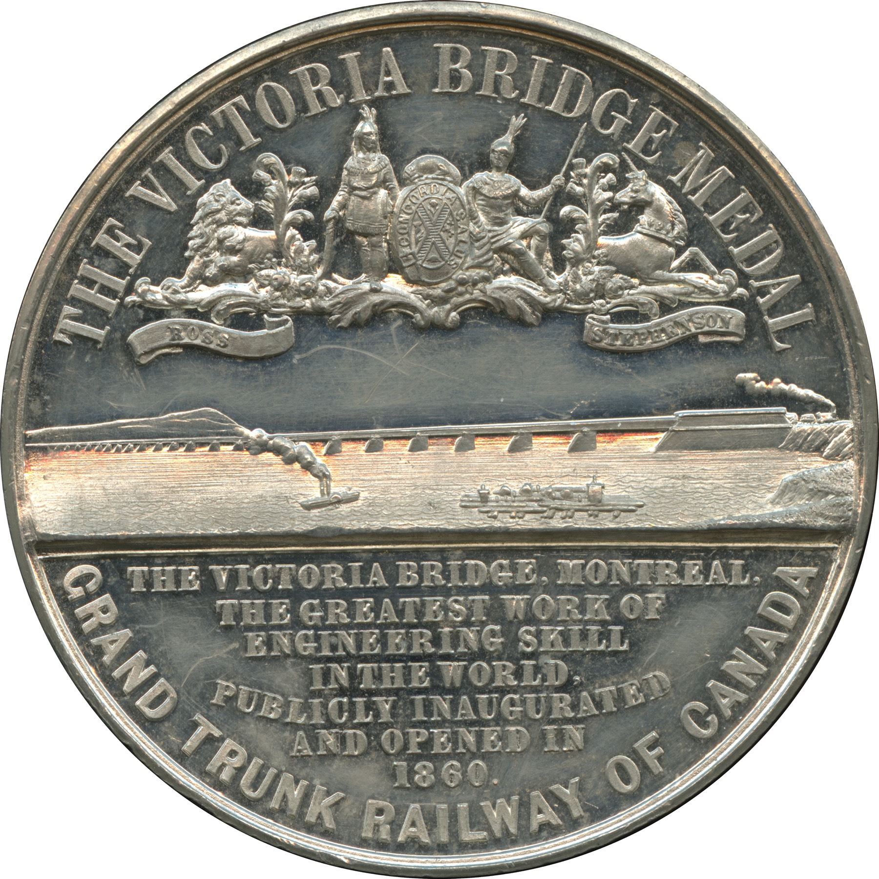Lr. 644 — The Victoria Bridge Hoffnung Medal - $7,000,000 Variety. 1860. White Metal. McLachlan-134, Breton-175. 51mm. 40.4g. Plain edge. Signed and issued by Montreal jeweller and silversmith Alfred Hoffnung. The second and more accessible variety with a 7 cut over the original 5 ($7/5,000,000). Far finer than usual with relatively clean deep cameo surfaces.