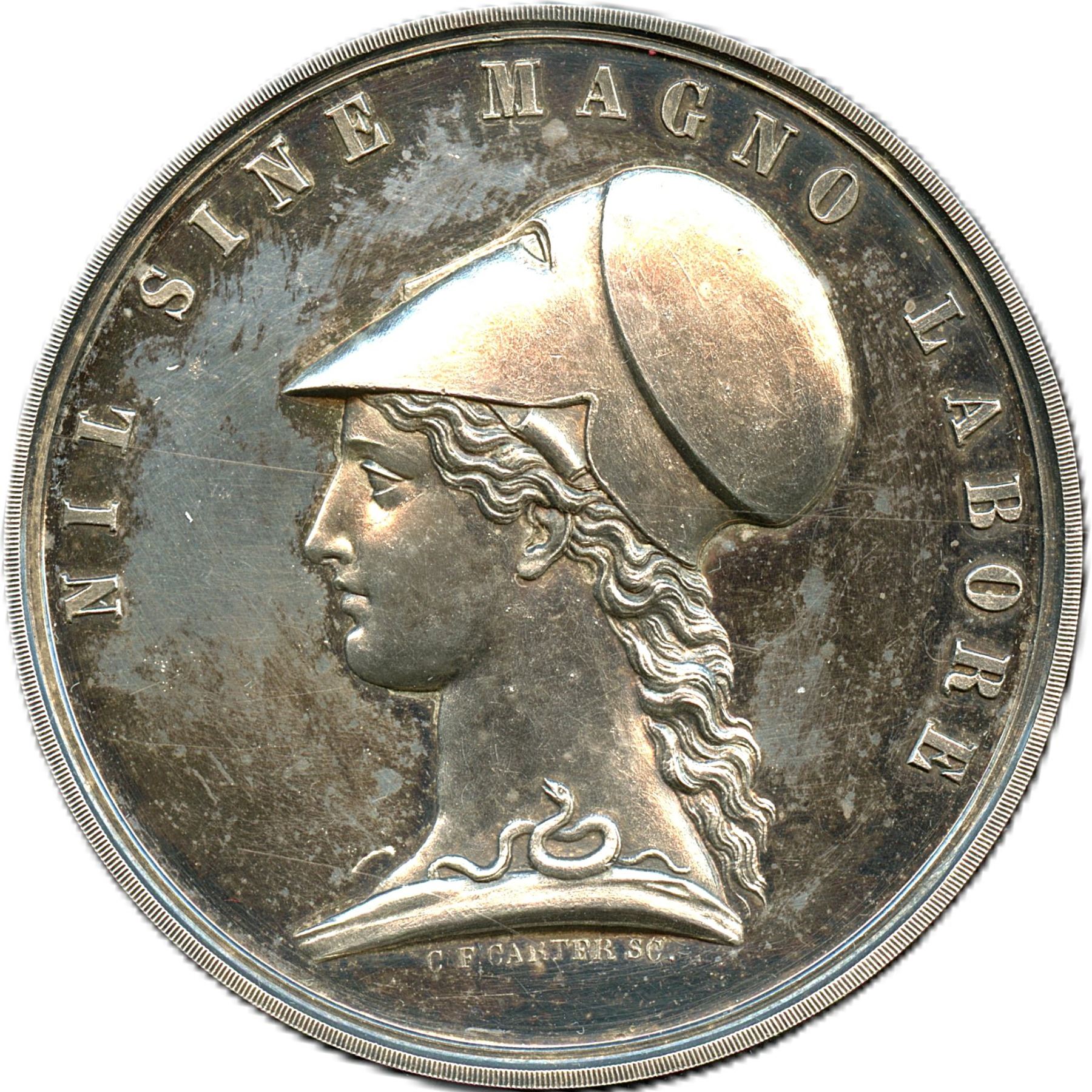 XRF analysis revealed a purity of 99.6% Silver. 40.6mm, 31.2g, Br. 115. Undated, Plain edge. Signed C.F. Carter SC, Violet patina over reflective fields. A glossy and unworn medal with fine hairlines on each side but poses no distraction, Scarce. UNC. 1pc. Ex. Hoare Auctions Sale #51 October 28, 1995 Lot 1449, Saul Hendler Medal Collection Part 1. From the Geoffrey Bell Collection.