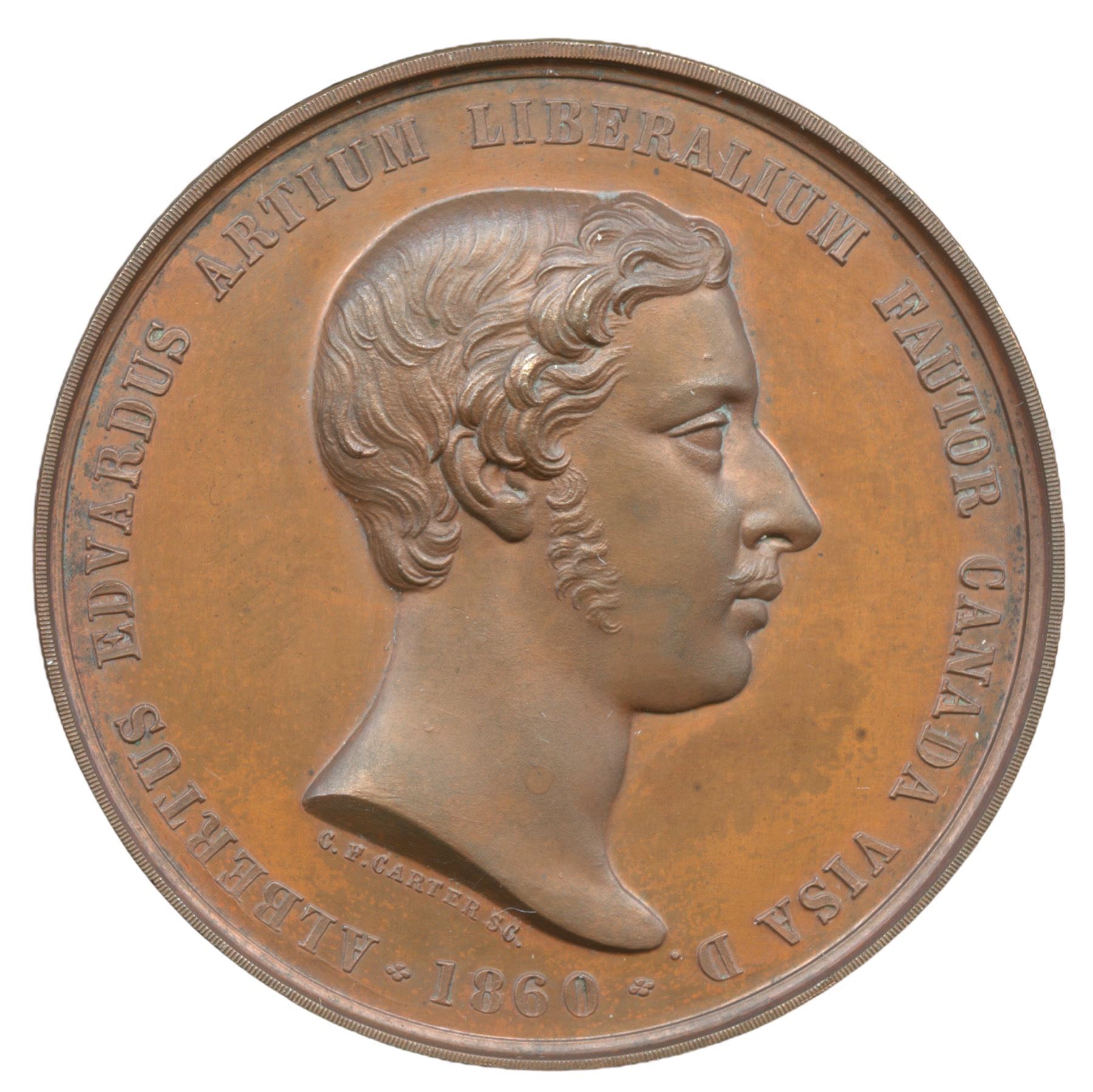 McLachlan-161, Breton-119. 41mm. 27.2g. Plain edge. Signed C.F. CARTER. Carter was a Birmingham medallist who advertised in the Canadian Antiquarian and Numismatic Journal. He was responsible for several McGill University medal designs. The Prince of Wales medal was founded by its namesake through an endowment of £200 during his visit to Canada. It was awarded for “logic and mental and moral philosophy.” This attractive award medal is near-perfectly preserved with iridescent toning over glossy golden-brown surfaces.