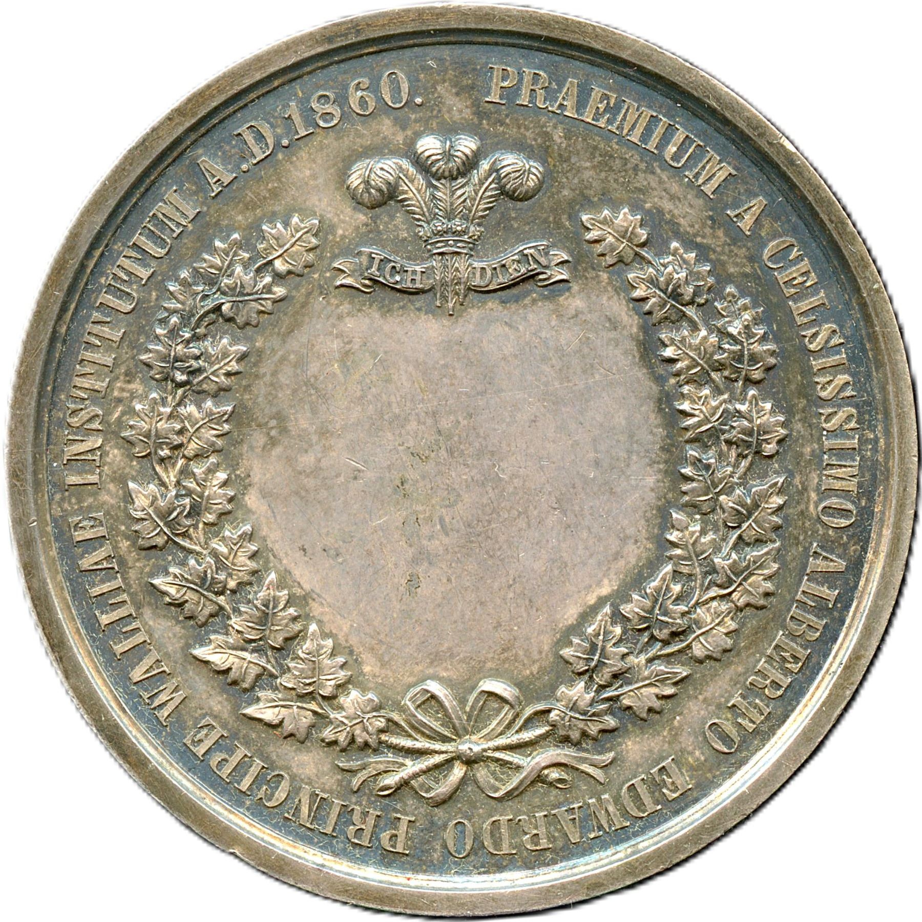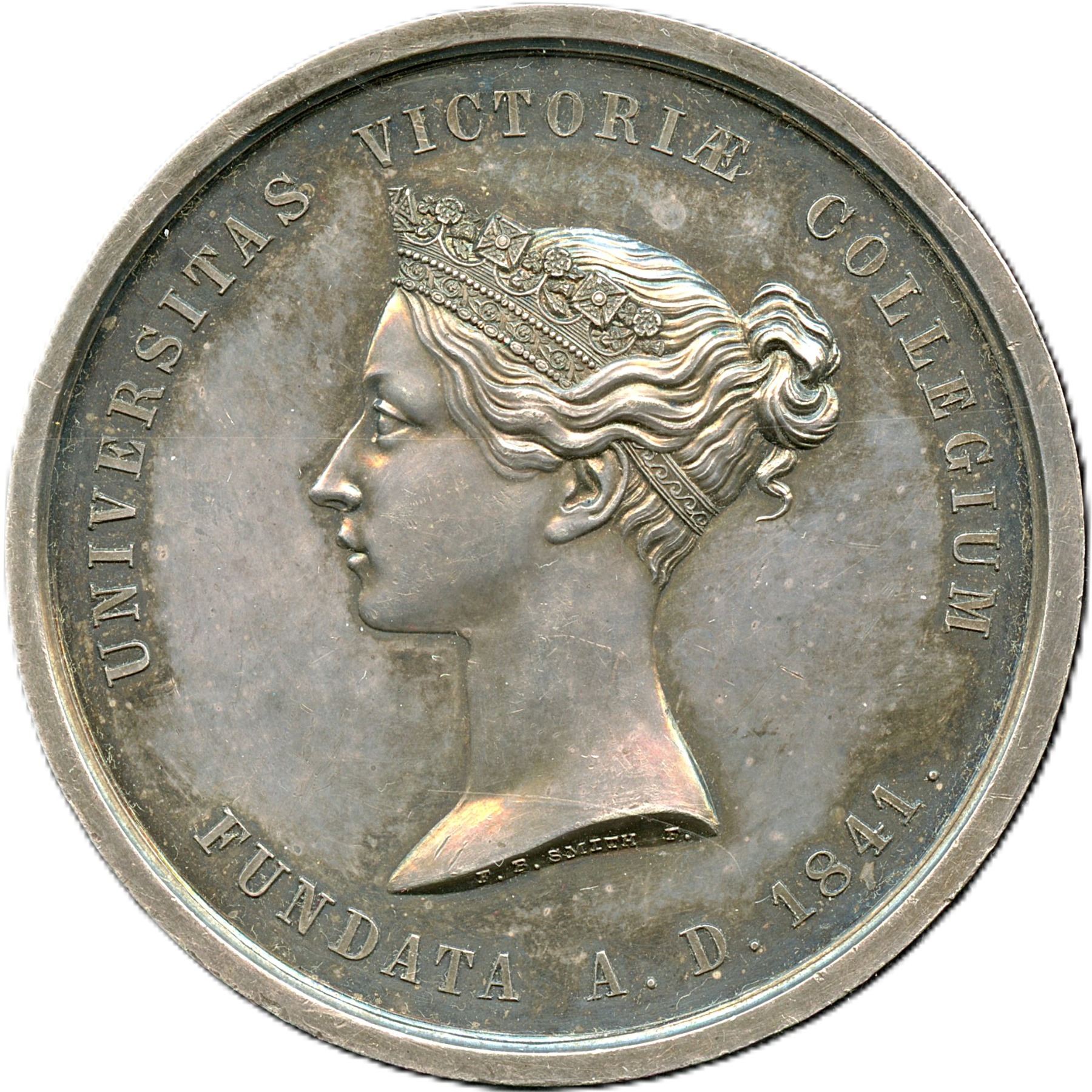 Br. 146, McLachlan 278. 44.2mm. 34.7g. Plain edge. Signed F.B. SMITH [New York]. Victoria College of Cobourg was founded in 1841 and became a fully-fledged university after arts classes were added to its traditional theological training a few years later. The college merged with the University of Toronto in 1890. This medal was founded by the Prince of Wales during his tour of Canada in 1860. Original surfaces with violet patina over reflective fields. A glossy and unworn medal with only a few tiny marks. Scarce. UNC. 1pc. From the Geoffrey Bell Collection.