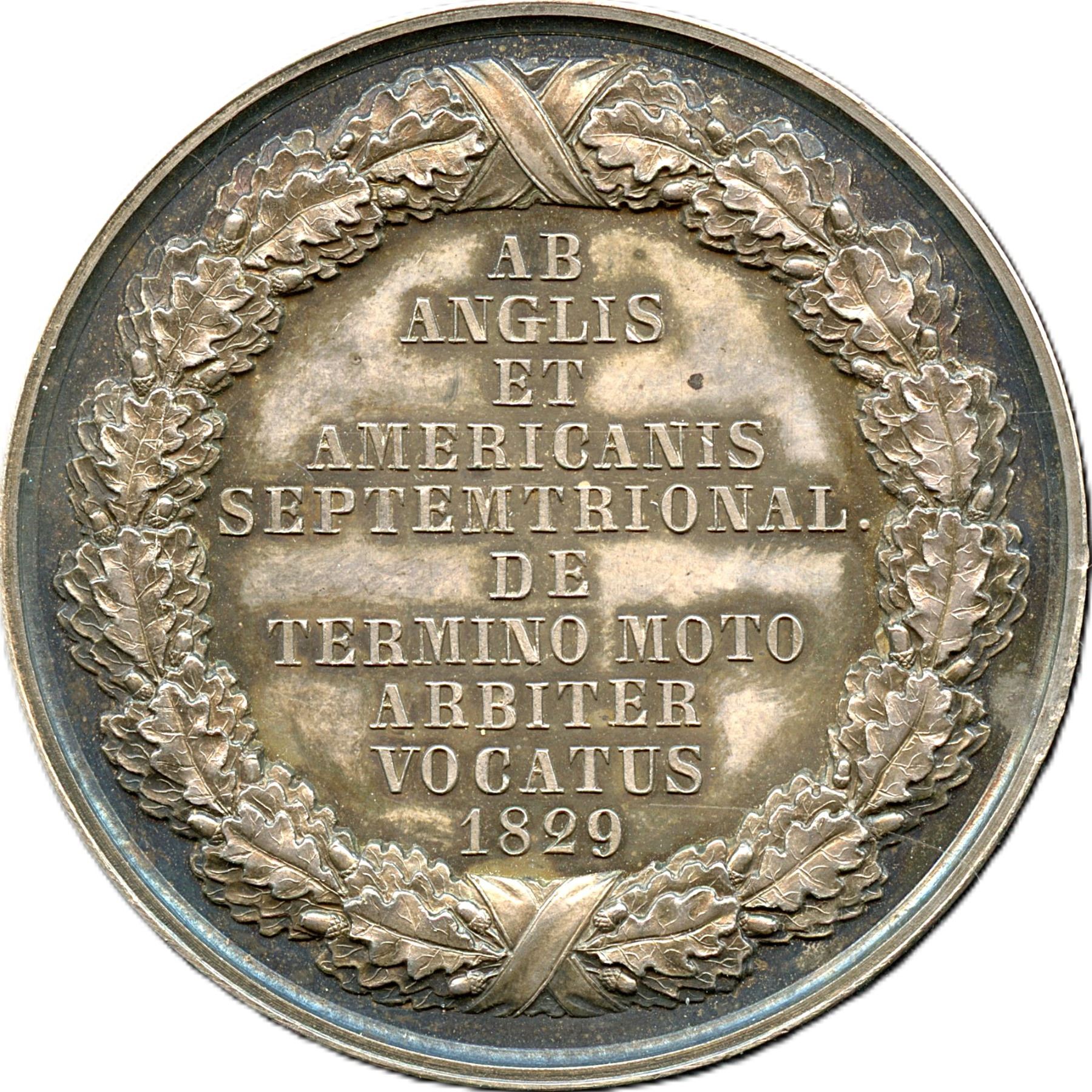 42.1mm. 28.3g. Plain edge. Unsigned. The U.S.-Canada arbitration medal commemorates the Netherlands’ King William I’s involvement as arbiter in the New Brunswick-Maine boundary conflict of 1829-1831. The medals were designed by Professor P.O. van Der Chijs and likely struck in Germany. In 1835, when these medals were first distributed, silver examples were sold for the equivalent of about $100 USD, Gilt bronze medals sold for half that, and bronze for less than one-third. Consequently, few silvers were purchased by collectors, and examples seldom come up for sale. EF, a few scratches, Seldom offered, Scarce.1pc. From the Geoffrey Bell Collection.