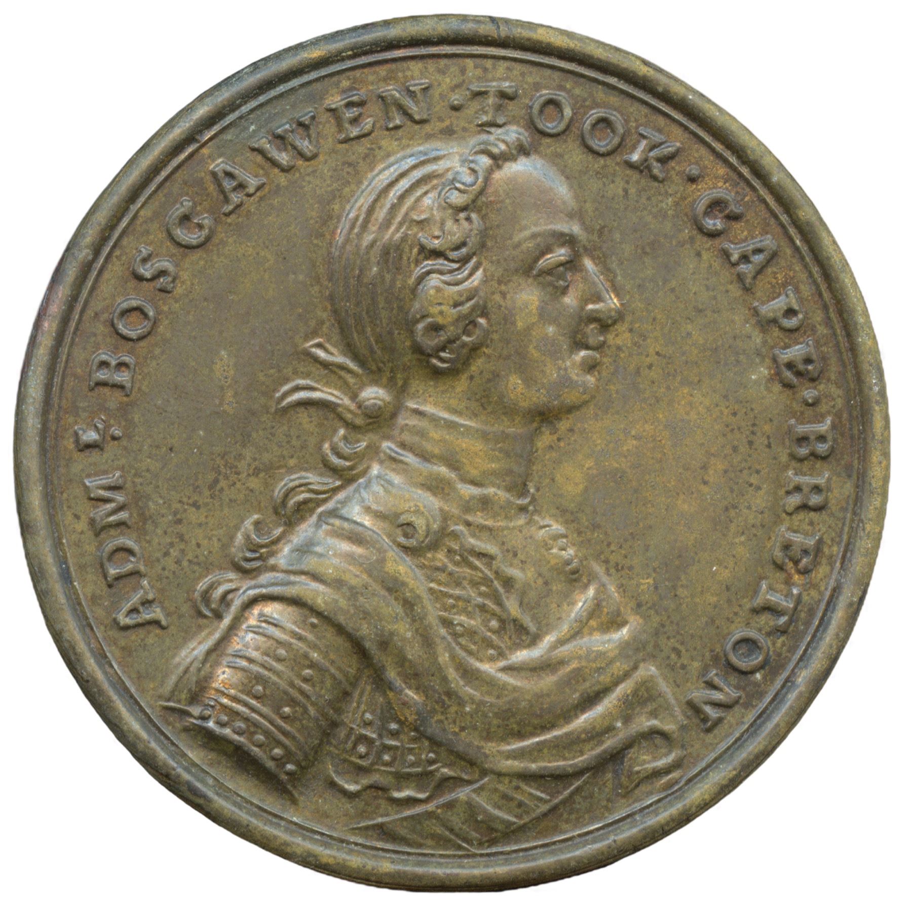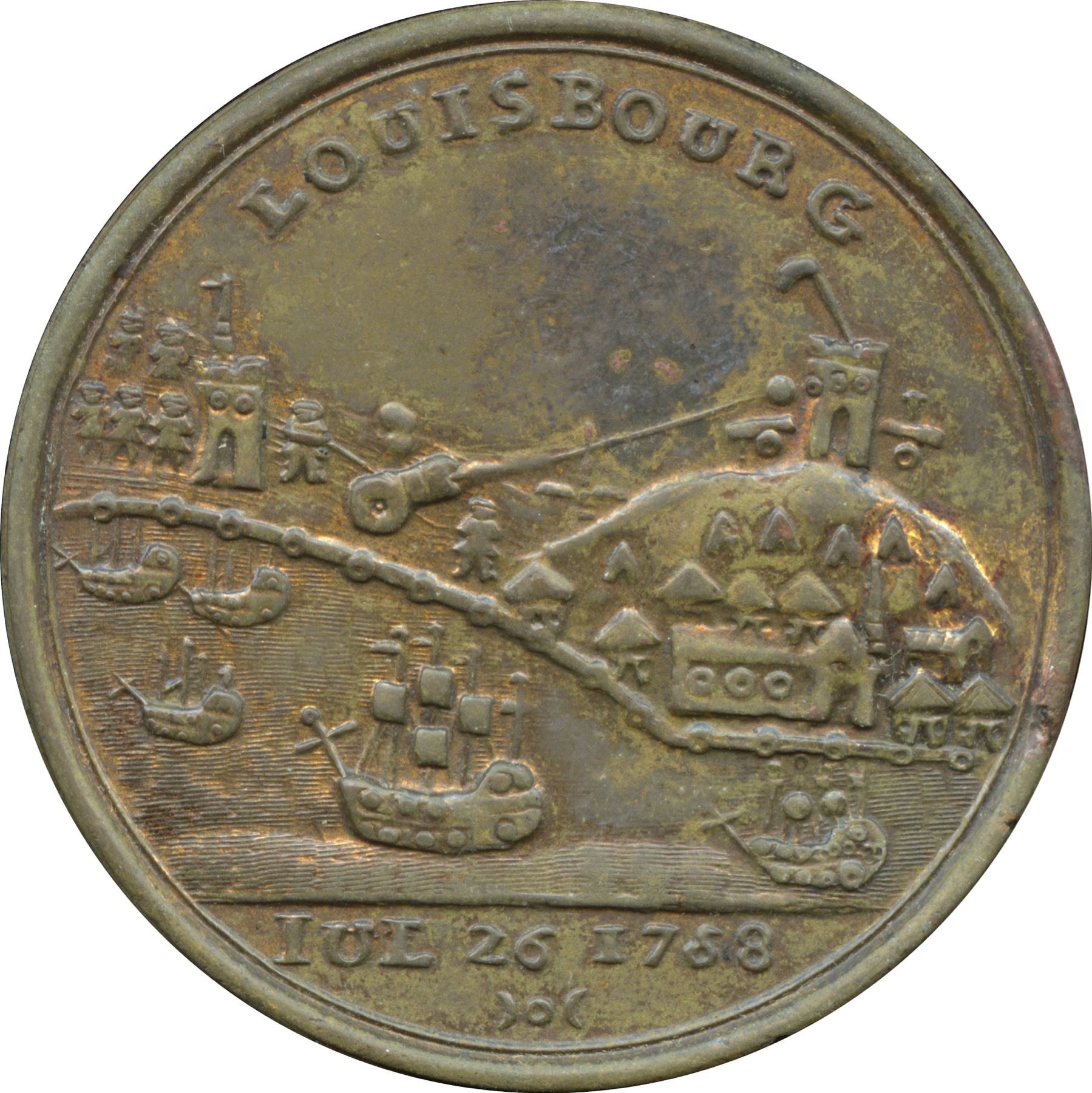 McLachlan-373, Betts-403, Breton-38. 40.8mm. 16.7g. Plain edge. Unsigned. Described in its last appearance in 2009 by the Stack’s cataloguer as: “A specimen of remarkable sharpness for this issue, one struck in cheap metal and most often seen well handled. Both obverse and reverse show definitive detail, particularly so in the charming if cartoonish and fantastical representation of Louisbourg by an engraver who'd never seen so much as a sketch of it. The surfaces are mostly glossy chocolate brown but for some reddish tones around devices; the natural color of pinchbeck, the metal in which all specimens of this variety were struck, tends towards gold but can turn this color if cleaned. Some faint old pinscratches are visible in the field.”