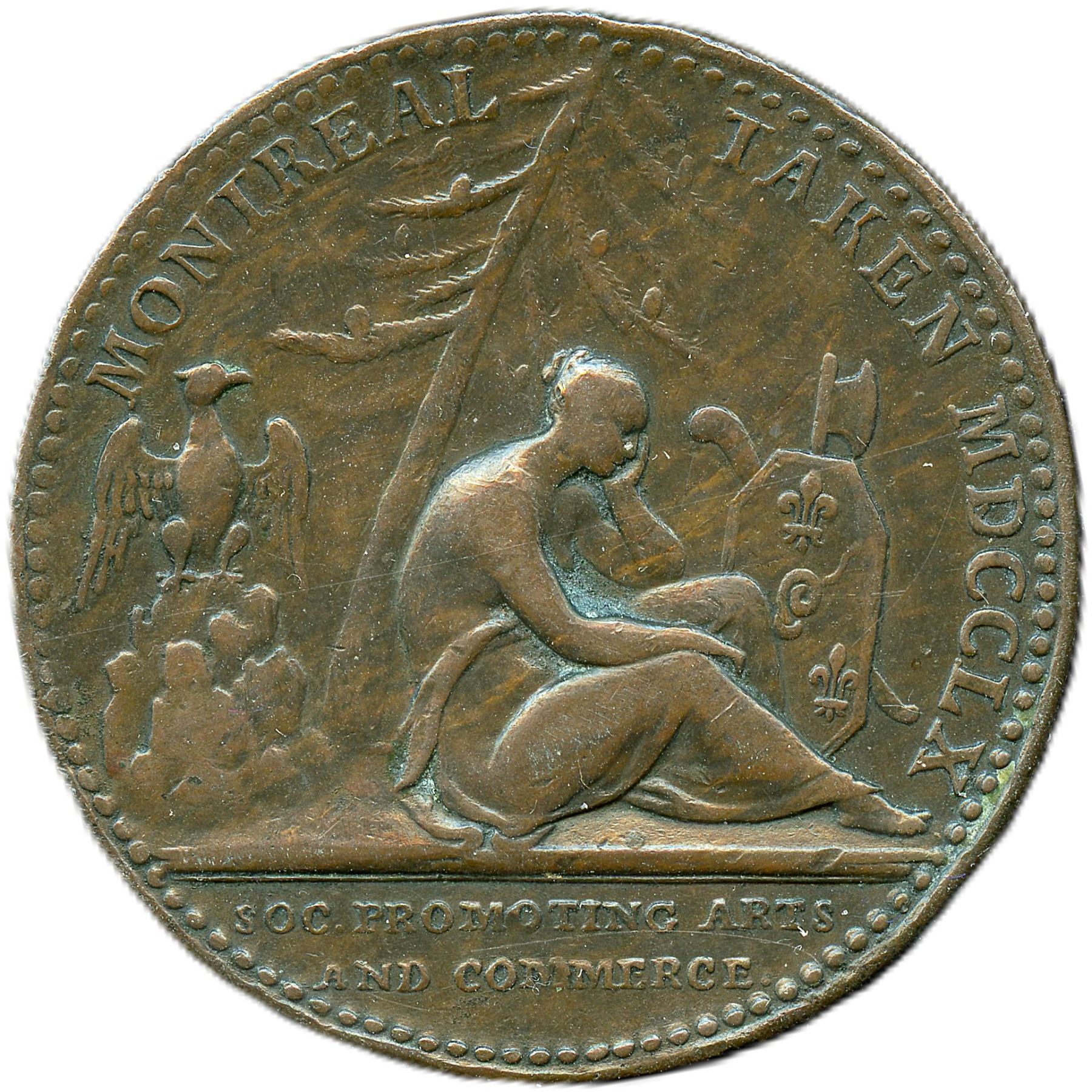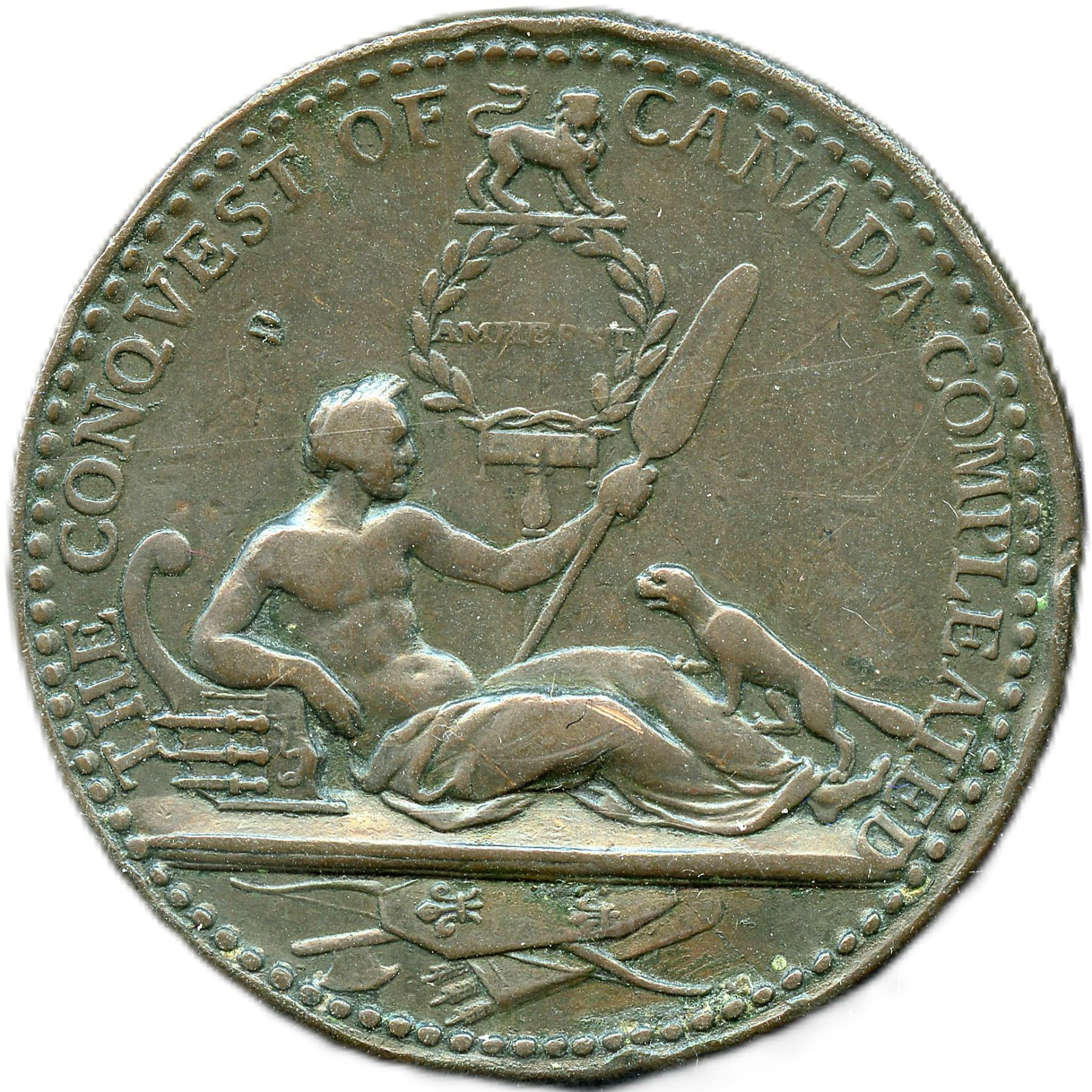 Betts-429, Br. 48, McLachlan-126, Eimer-679. 40.8mm. 29g. Plain edge with vertical striations, as made. Unsigned (by Kirk or Pingo). A Superb compliment to the silver example in the previous lot. Saint Lawrence River at rest under laureate triumph to Amherst, with beaver, French arms in exergue. Reverse: captive Montreal under pine with eagle and French armorial trophy. Commemorating the victory of the British over the French and their native allies in the North American theatre of the Seven Years' War (The French and Indian War) specifically, the fall of Montreal in September of 1760. The outcome of this was one of the most significant developments in a century of Anglo-French conflict: the 'Conquest of Canada' and further expansion of the British Empire. Handsome chocolate brown EF. From the Geoffrey Bell Collection.