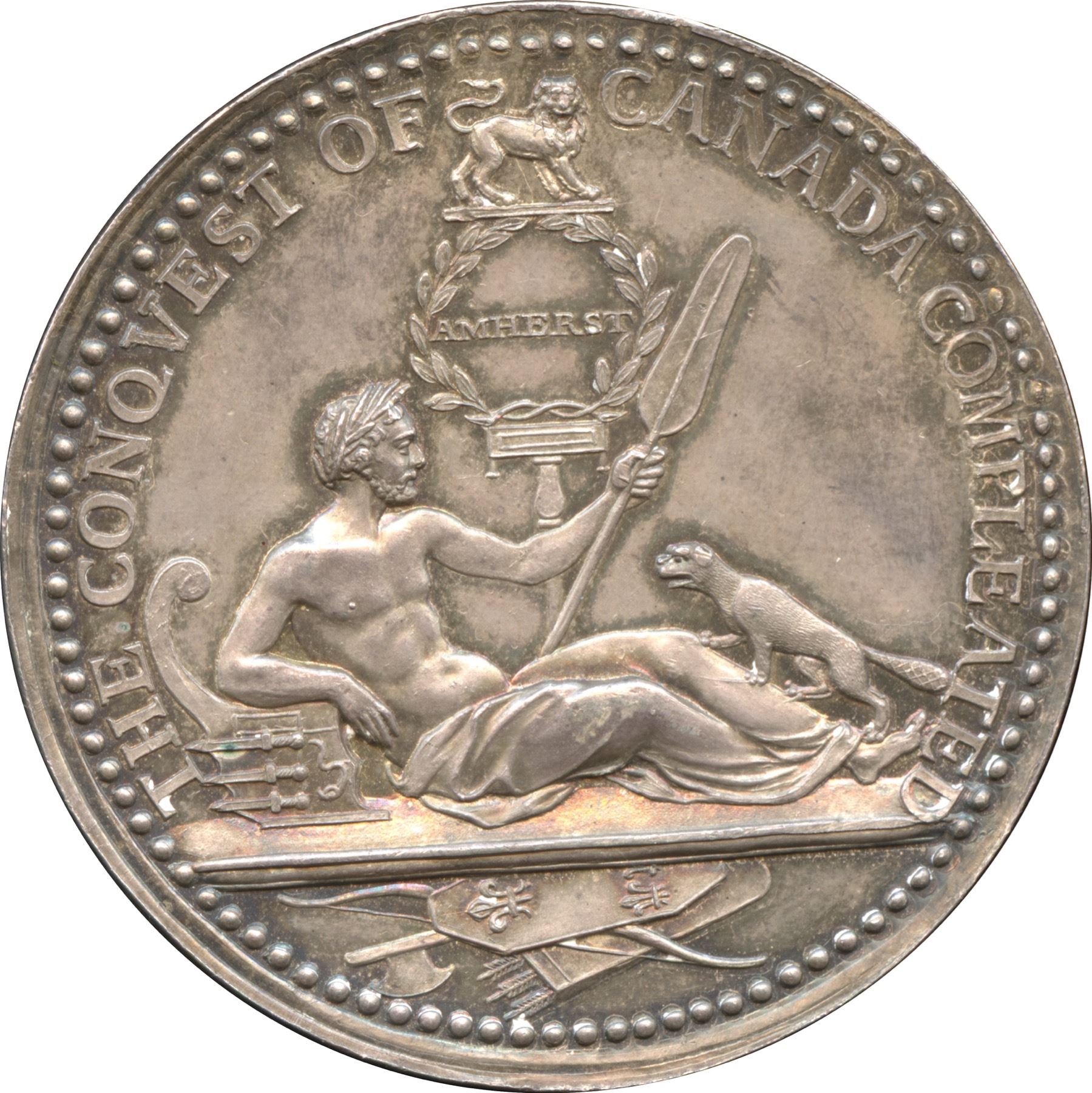 The obverse features a male figure emblematic of the St. Lawrence River reclining to the right with his arm on the bow of a galley and a beaver approaching. He holds a paddle in his left hand. Above, AMHERST appears within a wreath surmounted by a lion. A tomahawk, axe, and a quiver representing the Indigenous peoples and the arms of France are seen in the exergue. The reverse shows a female figure seated right against a tree. Again, the arms of France and a tomahawk representing the Indigenous peoples of Canada are shown in the right field. An eagle stands on a rock behind.