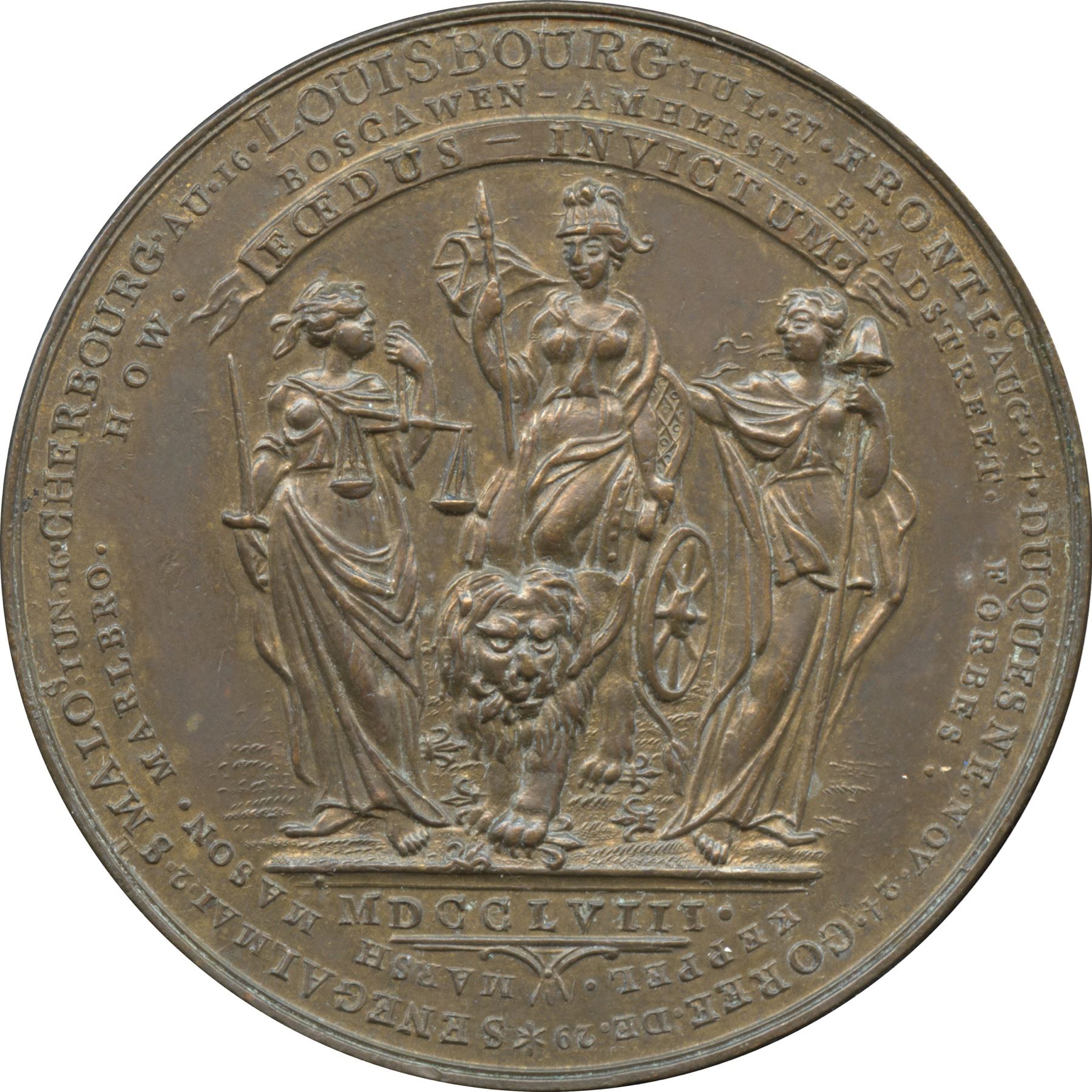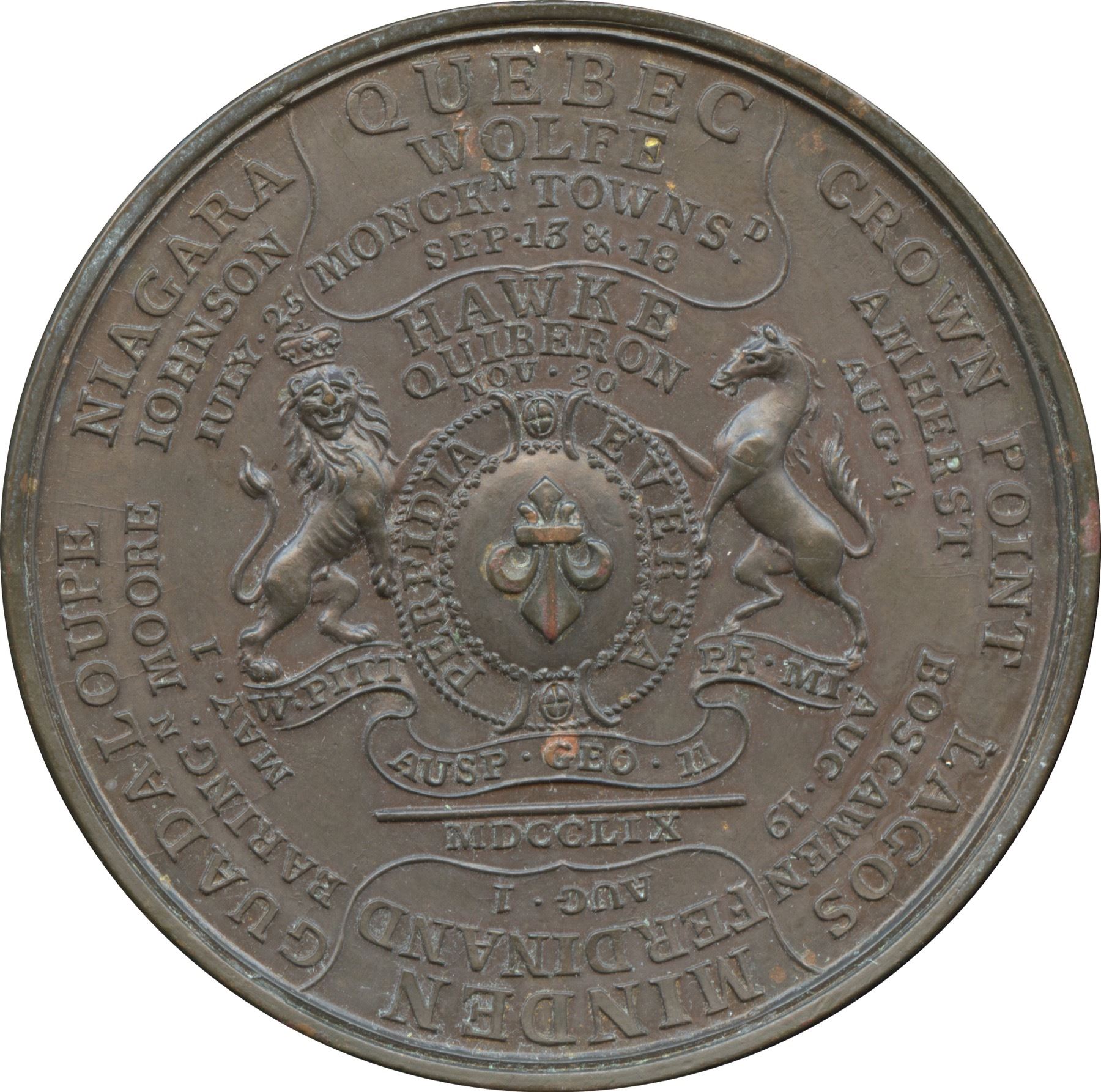 McLachlan-130, Betts-419. 43.3mm. 30g. Plain edge. Unsigned. Although unlisted by LeRoux or Breton, McLachlan noted in 1886 that this piece is a mule “struck from two reverse dies of medals for victories in 1758 and 1759.” It features the reverses of Lr. 861 and Lr. 862. Known in copper, brass, gilt copper, and silver. This is a collectible Seven Years’ War medal with full design detail and clean surfaces. Mostly deep brown with golden accents.