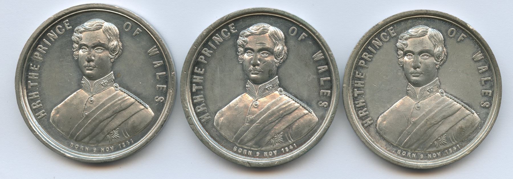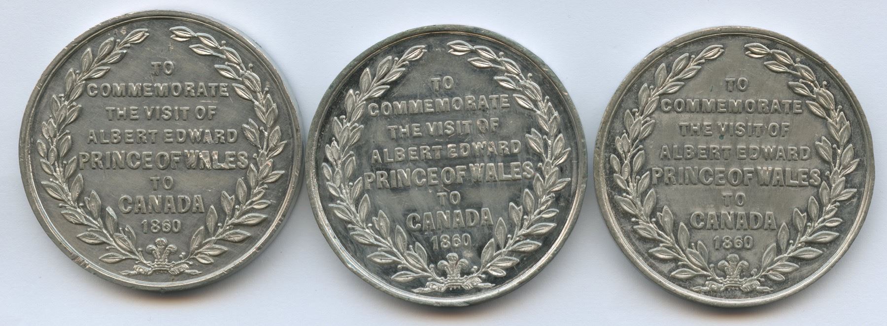 McLachlan-301. Breton-178. Lot of three. All 43.5mm and struck from the same dies with plain edges. However, thicknesses vary: 1.) 19.2g. 3mm thick. 2.) 21.7g. 3.7mm thick. 3.) 23.84g. 4.2mm thick. All brilliant with varying degrees of slight wear and scattered marks. None with any significant distractions. These souvenir medals were struck in Birmingham and commissioned by Montreal jewellers Savage & Lyman.
