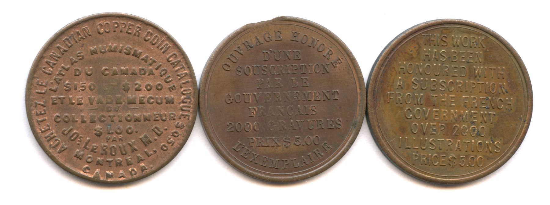 Lot of three (3) tokens. 1.) Lr. 975, Breton-583. 25.9mm. 4.87g. Plain edge. Unsigned. Breton reports 86 struck in January 1886. Clashed obverse die. Mostly red. Unc. 2.) Lr. 994p, Breton-585. 25.0mm. 4.52g. Plain edge. Signed K&S. Small clip at 12 o’clock. Reportedly 1,000 pieces struck in 1891. Glossy brown with copper around the devices. Unc. 3.) Lr. 994r, Breton-586. 25mm. 4.73g. Plain edge. Signed K&S. Same quantity struck as last, also in 1891. Obverse is rough, reverse shows evidence of cleaning. VF.