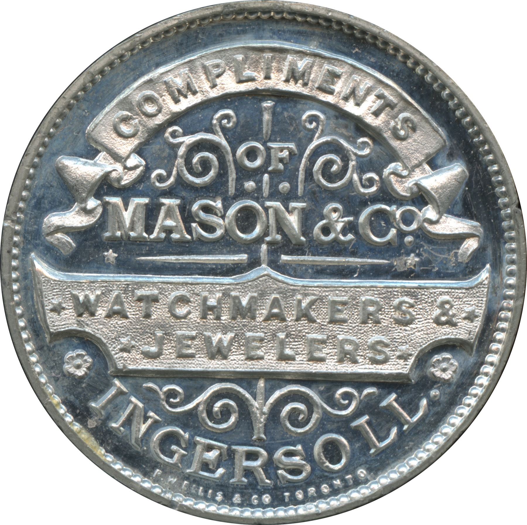 Lr. 981 — Queen Victoria Diamond Jubilee / Mason & Co. Watchmakers. Undated (1897). White Metal. 34.8mm. 18.9g. Plain edge. Signed P.W. Ellis & Co. Toronto. A totally brilliant, deeply contrasted commemorative medal sponsored by Mason & Co., watchmakers and jewellers, of Ingersoll, Ontario.